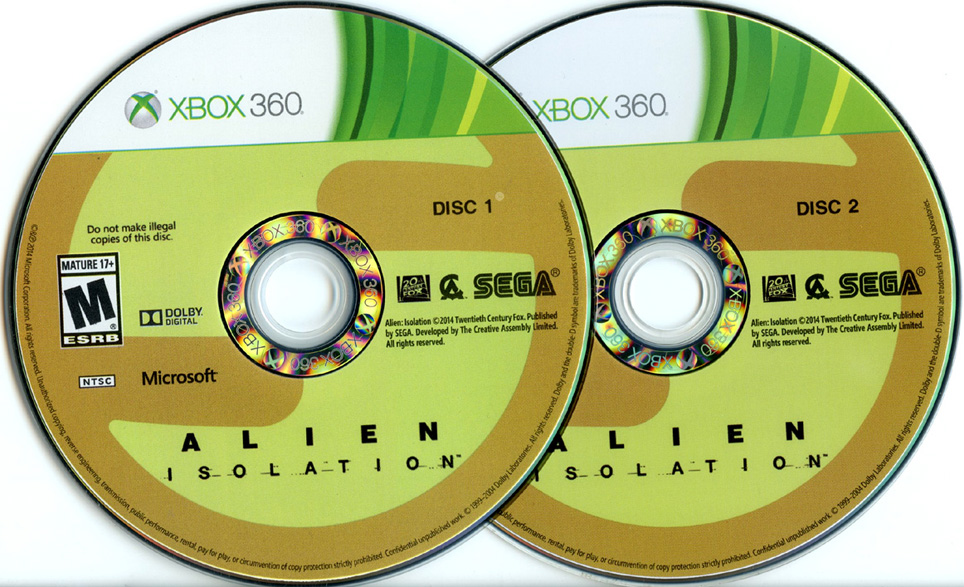 [Below: Alien Isolation Xbox 360 version. Discs.]