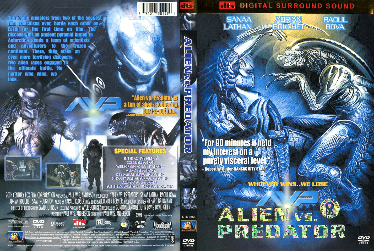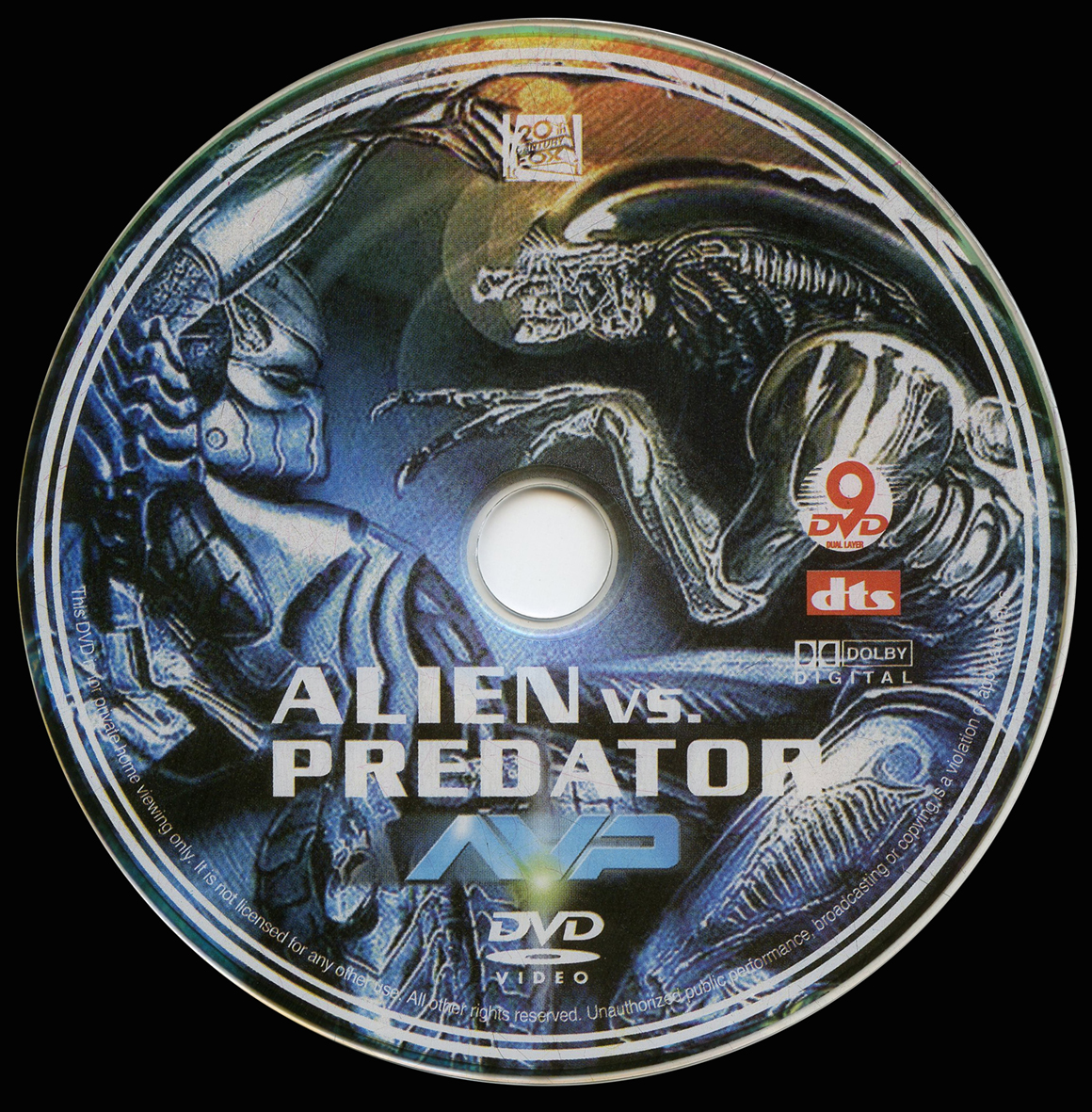 [Above: This is an odd Aliens vs. Predator release. It is a DVD-9, which is a dual layer single-sided DVD that holds up to 8.5GB of data. I can't say I've ever seen another DVD using this. The text Aliens vs. Predator is reflective, although you can't see it in the picture.]