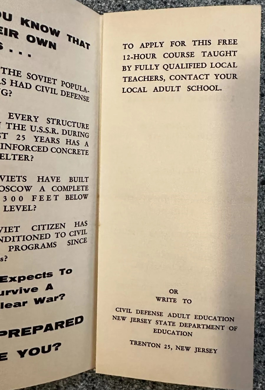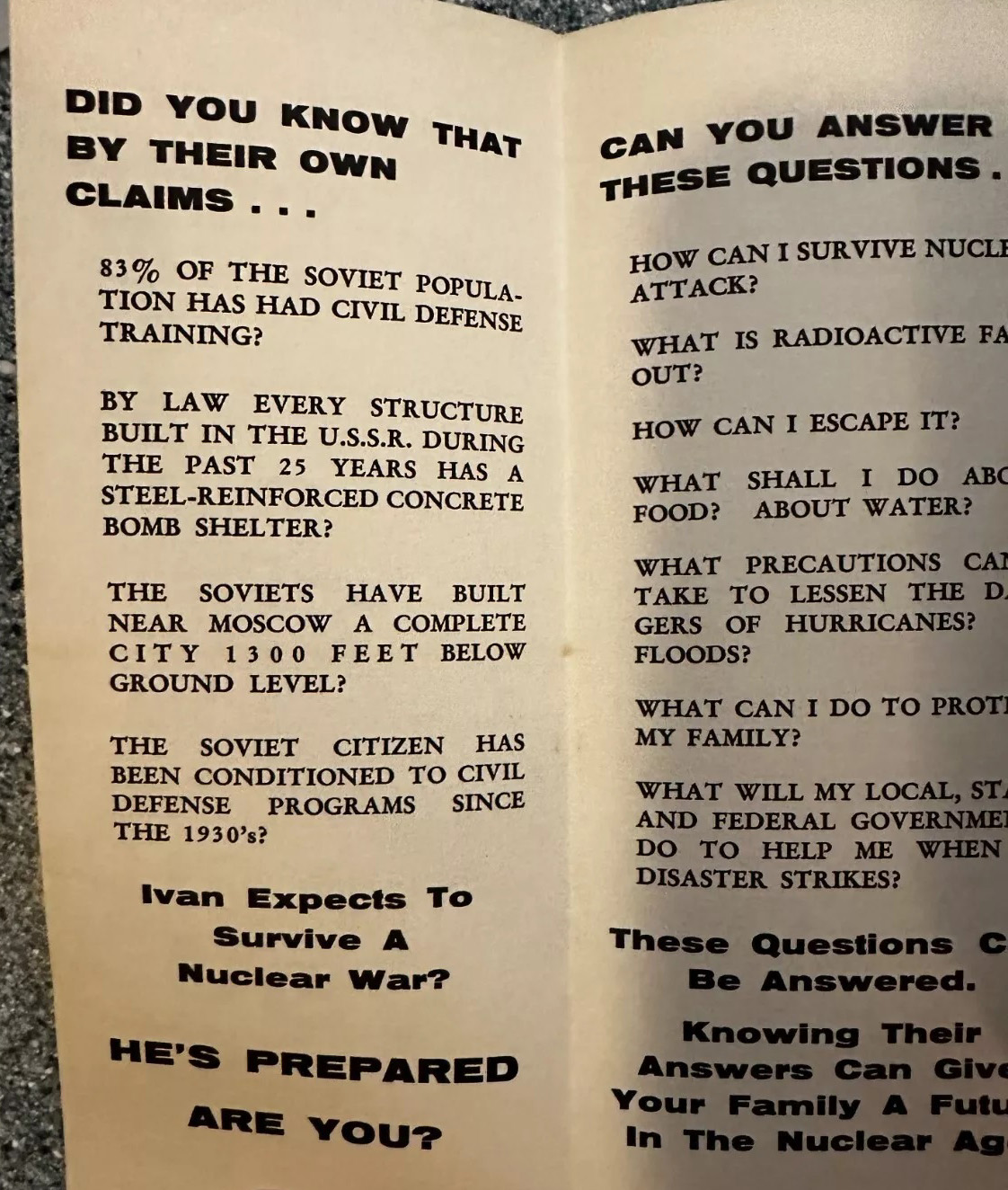 [Above: Survival and You pamphlet - inside. It sure makes you think when confronted with the information here. Could it be that commies valued their citizens more than democratic capitalists? Remember the nuclear war instructions from the Cold War? Go to the innermost part of a building, or a basement if applicable. Put your head down between your knees... and kiss your ass goodye!]