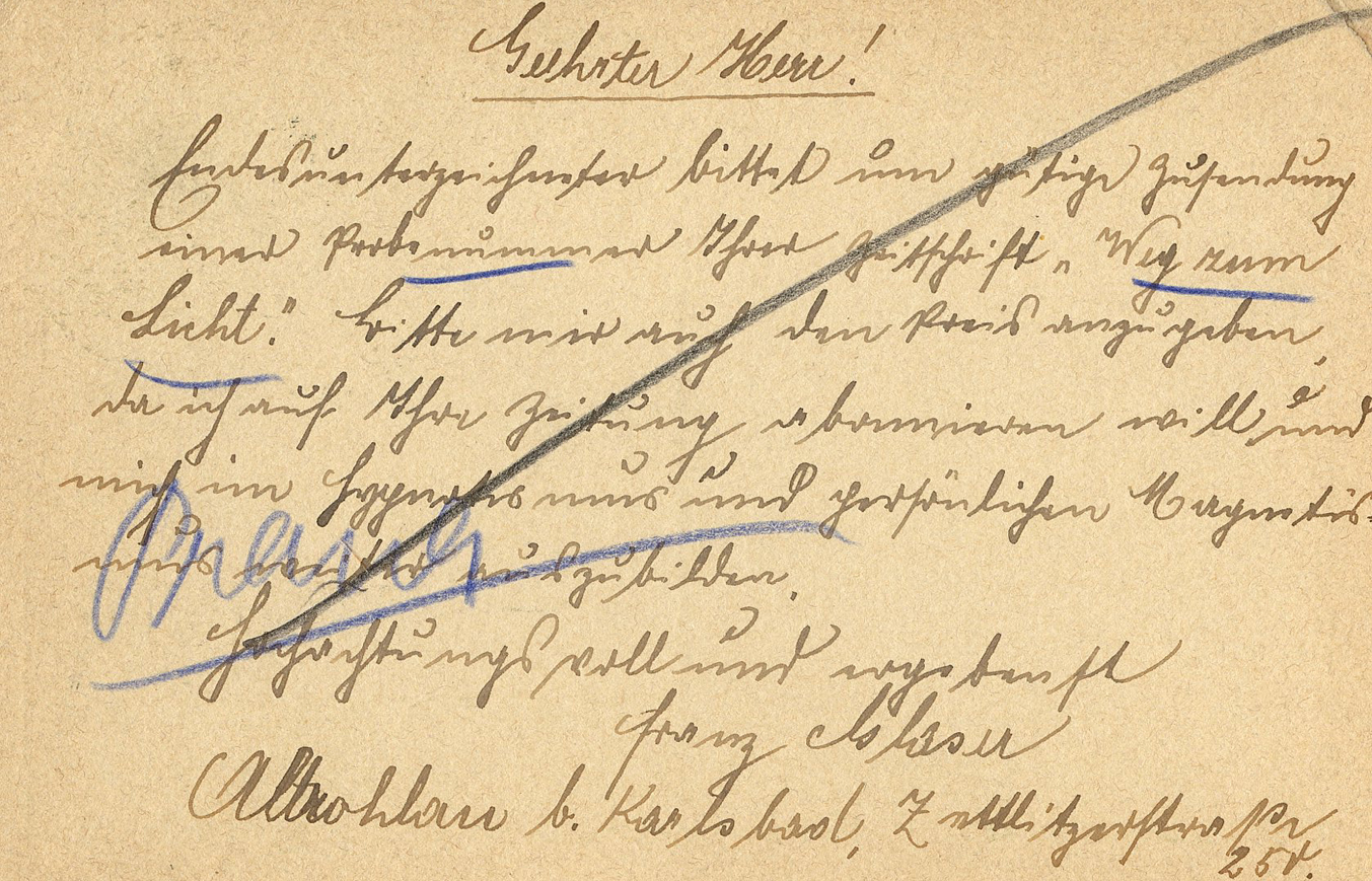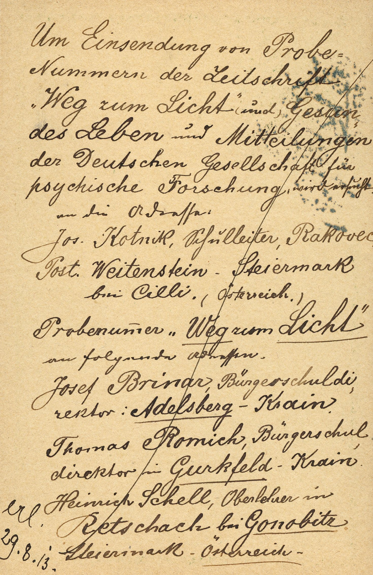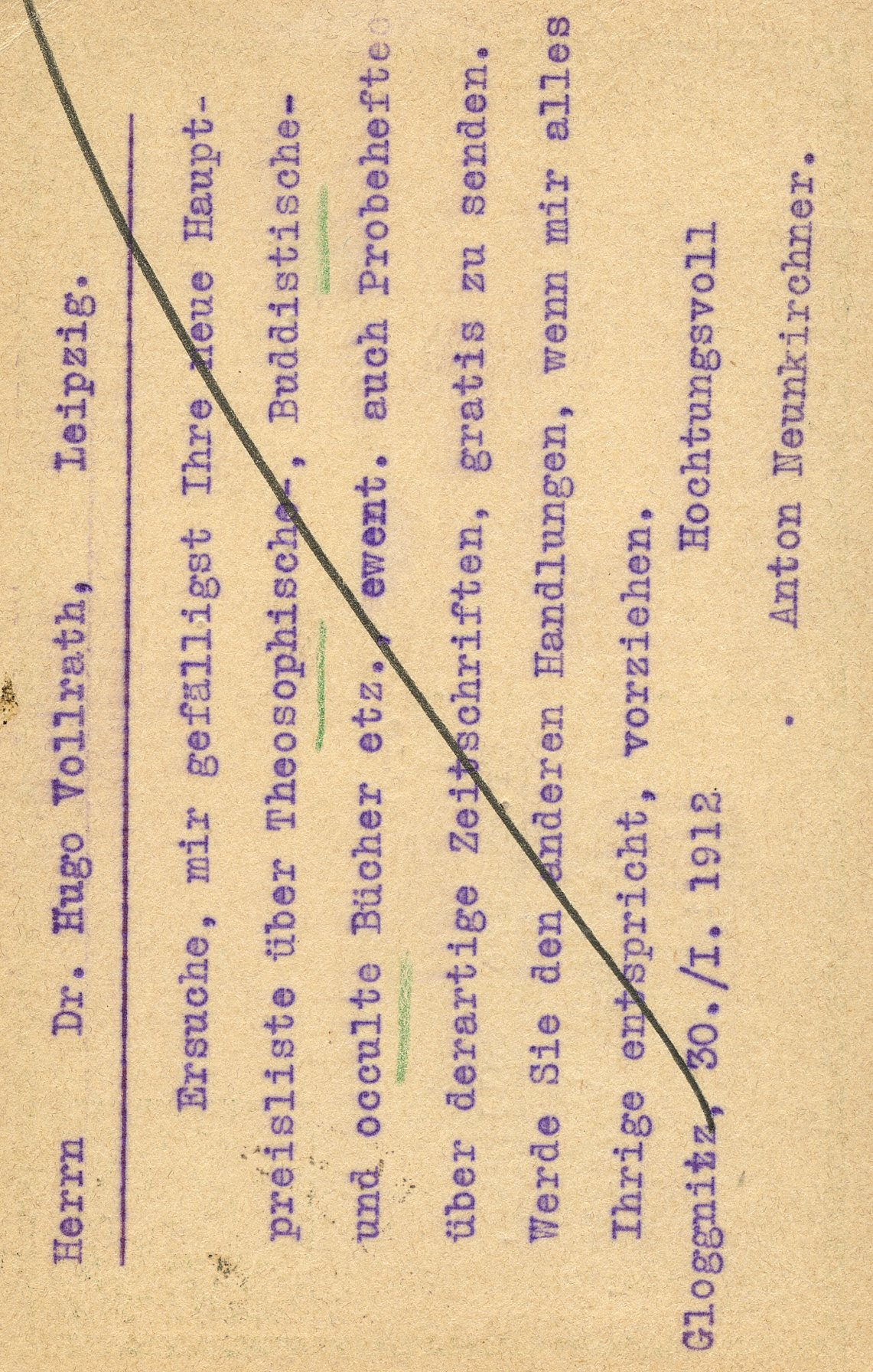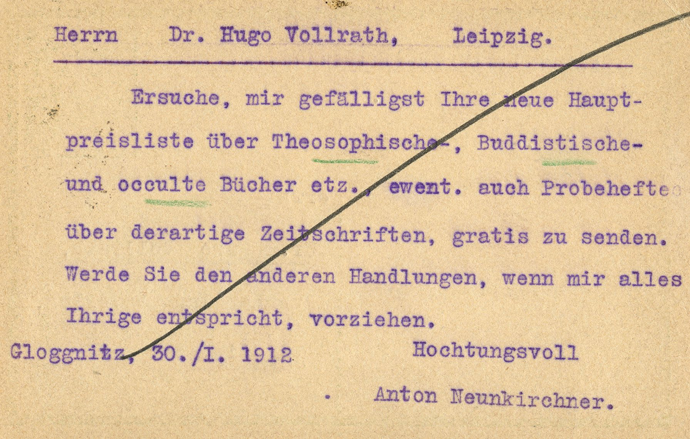 'Vollrath was arrested in 1941 in his birthplace Loitzsch near Zeitz and detained there. His health suffered greatly as a result. His Theosophical friends therefore abducted him in 1942 to Lützschena, a place near Leipzig. There he died under their care in 1943.'