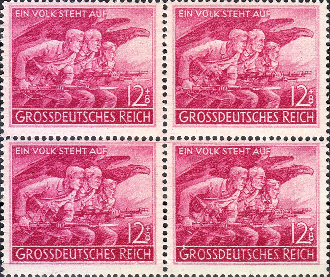 [Above: Postage stamps released in the closing days of the war honoring the Volkssturm. It says: 'Ein Volk Steht Auf' (A People Rises Up).]
