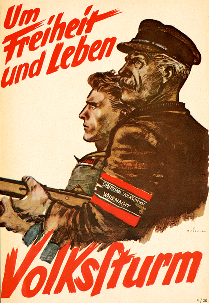 [Above: Volkssturm recruiting poster. It says: 'Um Freiheit und Leben' (For Freedom and Life).]