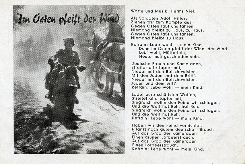 [Above: Postcard entitled 'In the East the Wind Whistles' It begins: 'As soldiers of Adolf Hitler - we march to battle, Eastward let us go...']