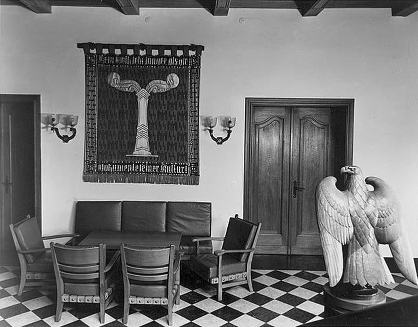 [Above: The entrance to Darré's headquarters -- note the tapestry with the irminsul symbol -- it says: 'No people lives longer than the documents of its culture'.]