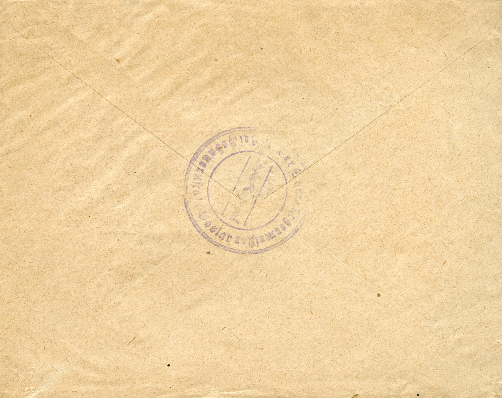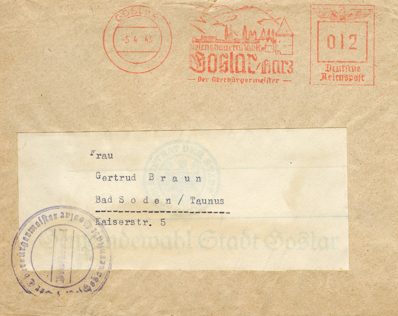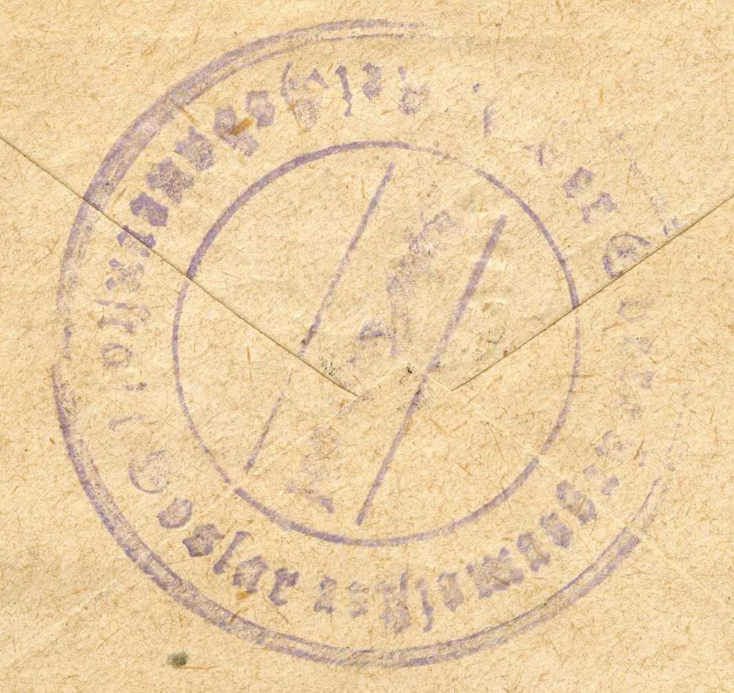 [Above: This is a recycled envelope. If you look closely you'll see they glued paper over the old address. This was due to wartime shortages. The Goslar cancels are from April 5, 1943. Click to enlarge.]