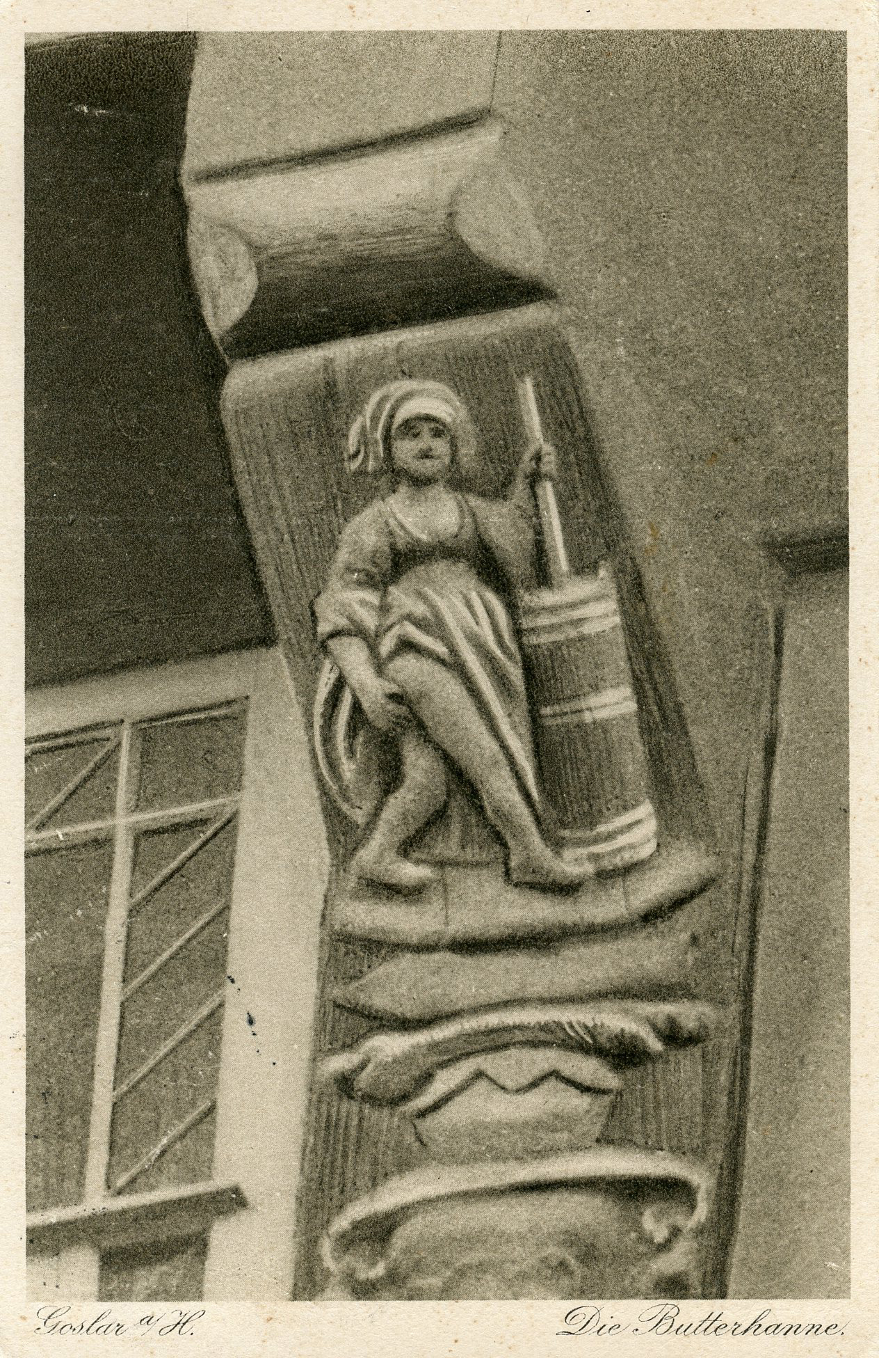 [Above: This is a postcard from Goslar with what looks to be a carving of a woman churning butter. Click to enlarge.]