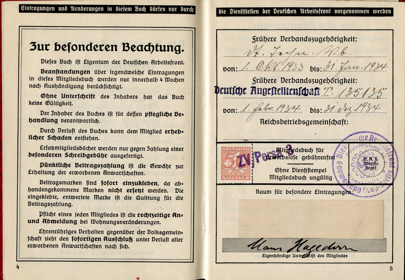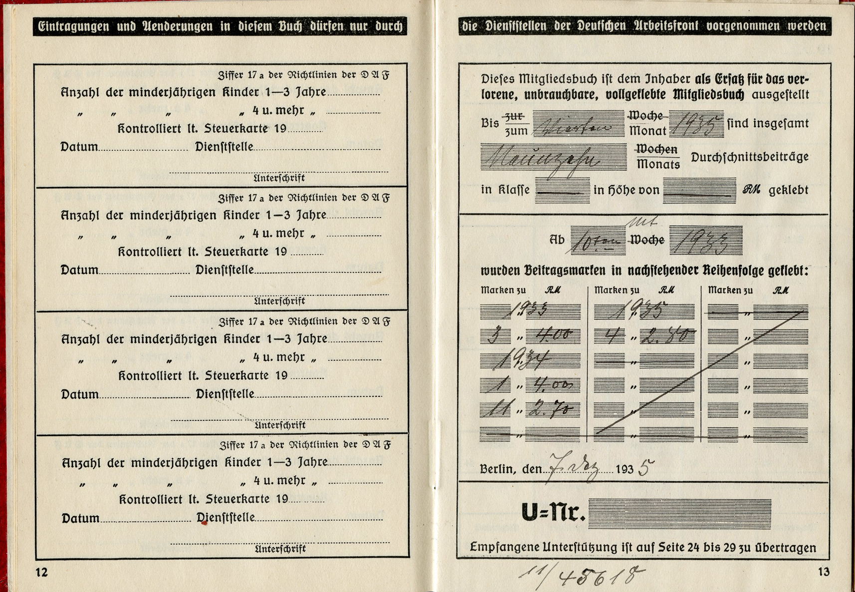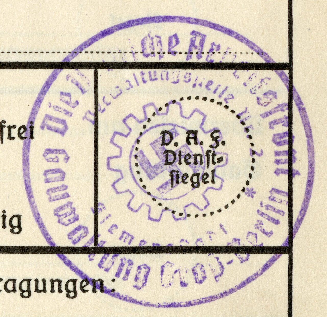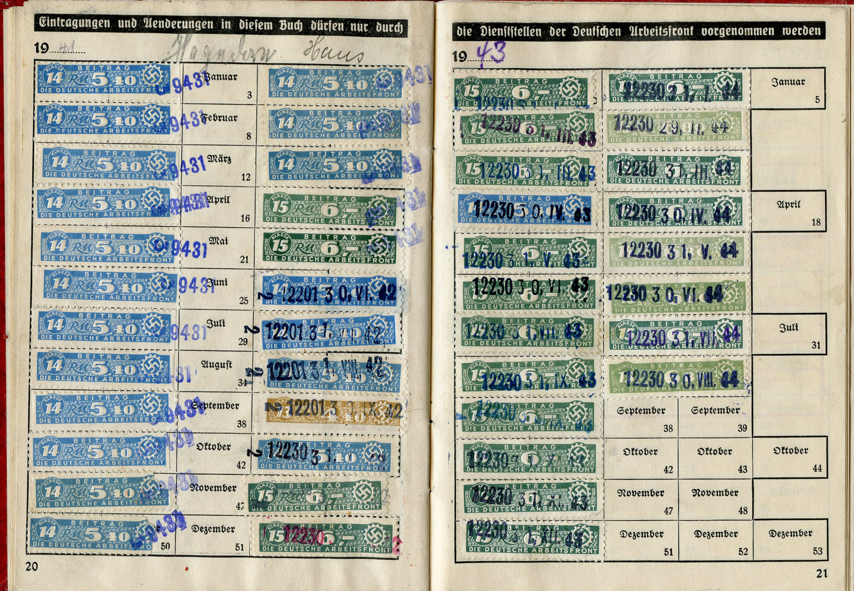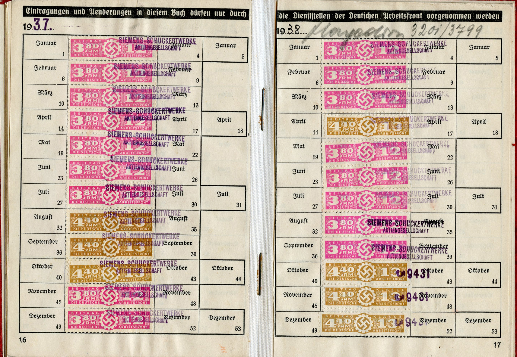 [Below: Here are some huge ink stamps, perhaps replacing the normal tax stamps, and they reveal our worker is with Siemens again. And he worked for Siemens until nearly the end of the war, March 31, 1945. Okay Siemens, I want my damn rail car.]