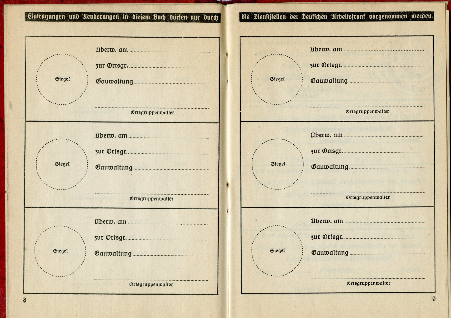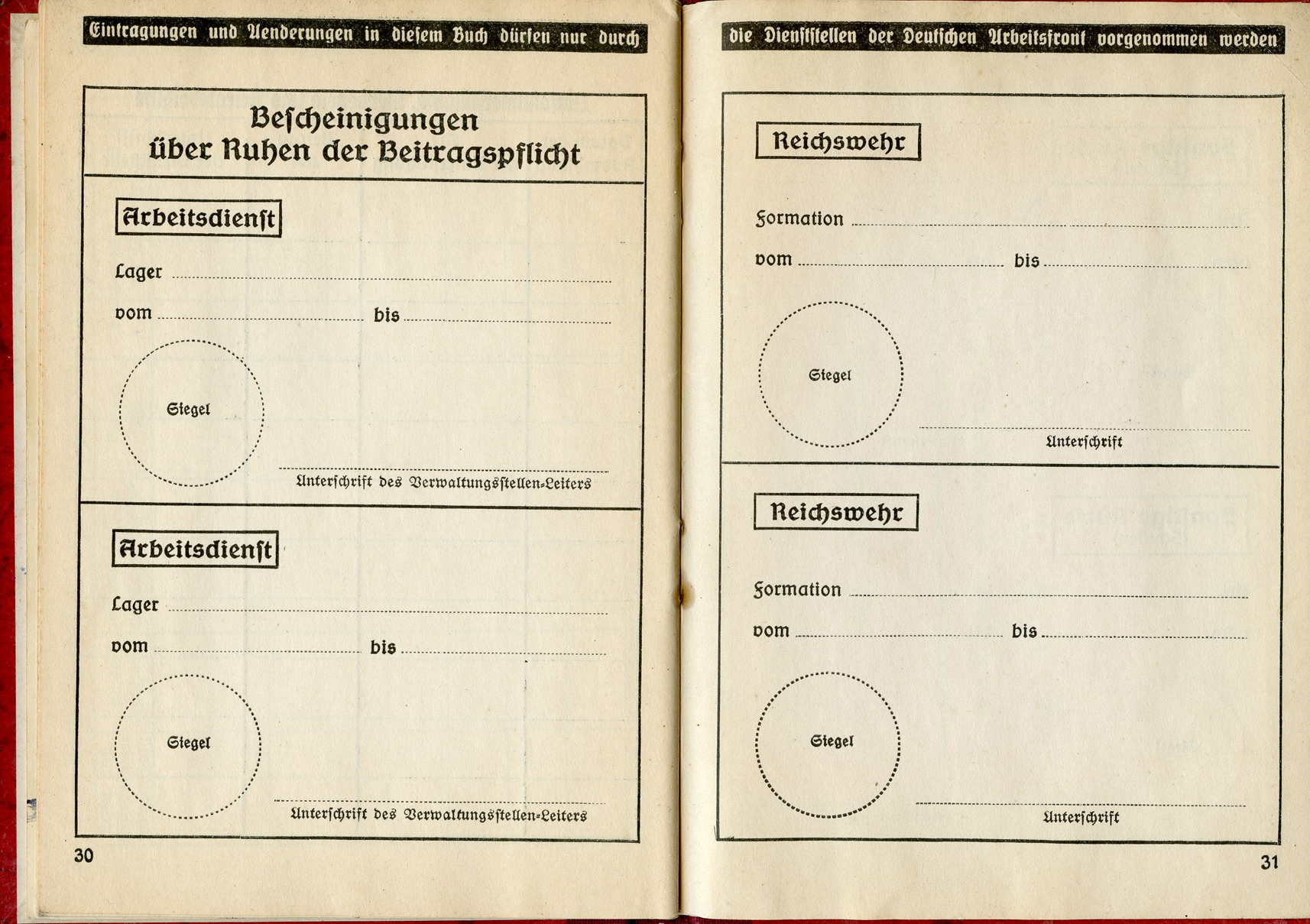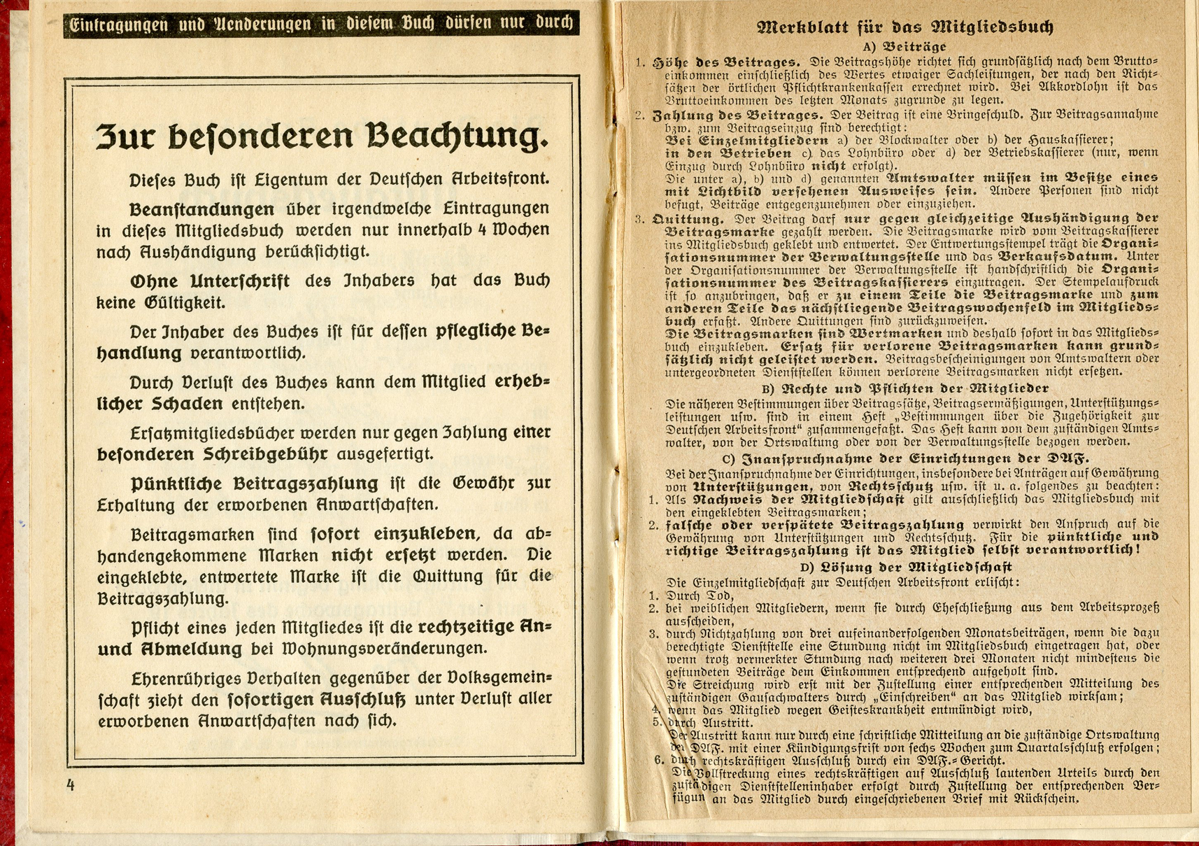 [Below: This has a 'merkblatt' (information sheet) glued into the beginning of the book. Usually these are just loose stuck inside the DAF books, but mostly missing altogether. The merkblatt is made of acidic, almost newspaper quality paper, and is seeping into the pages around it.]