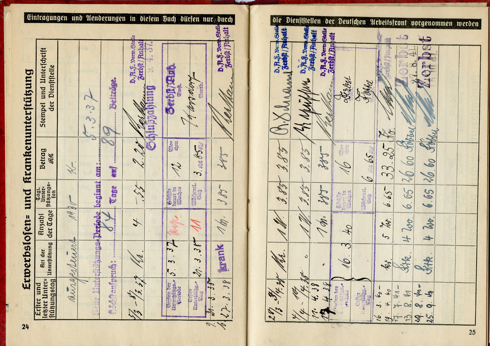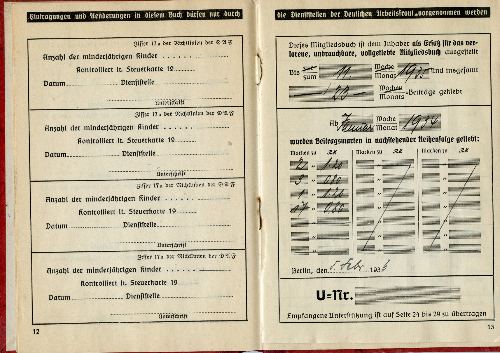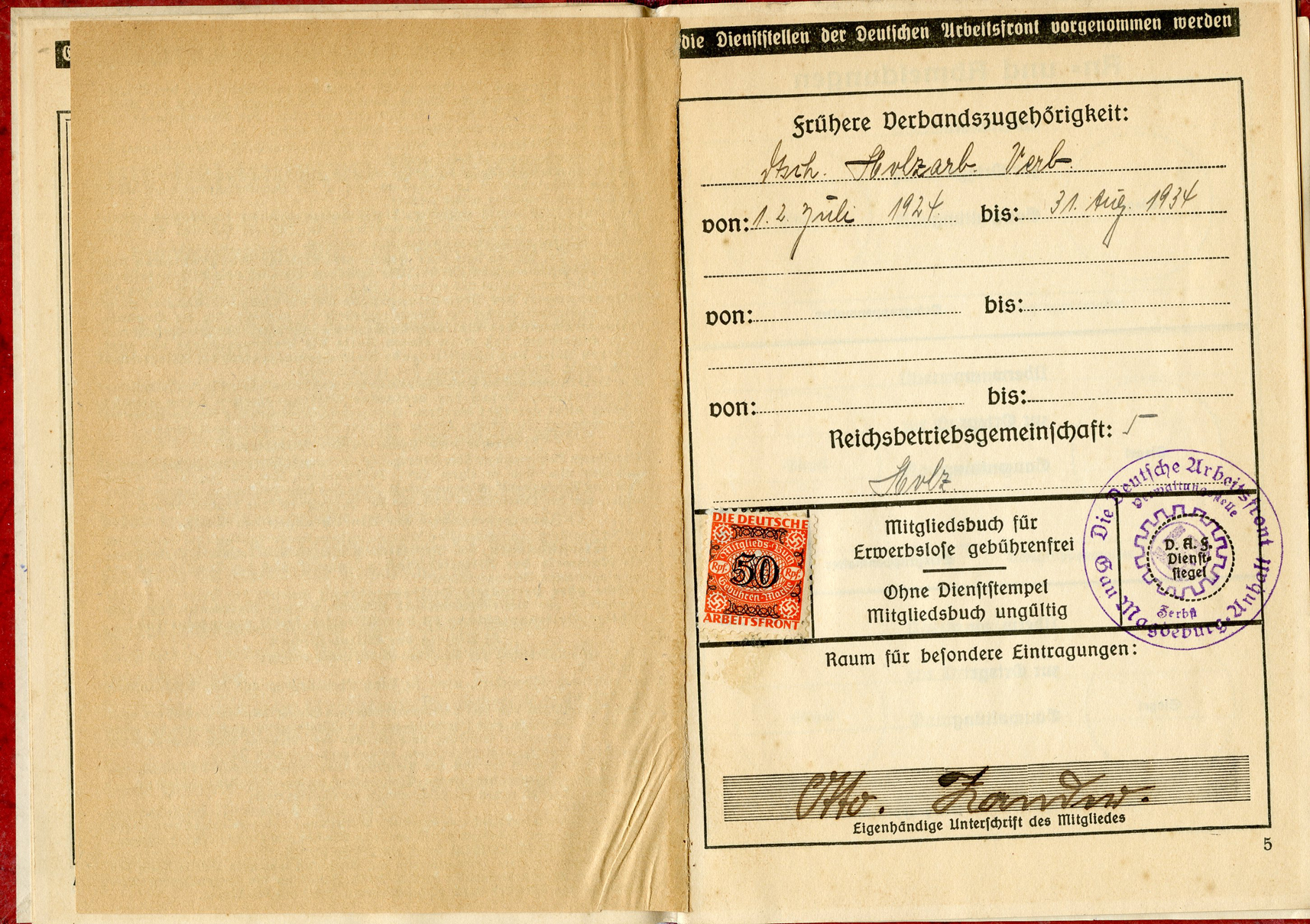 [Below: This has a 'merkblatt' (information sheet) glued into the beginning of the book. Usually these are just loose stuck inside the DAF books, but mostly missing altogether. The merkblatt is made of acidic, almost newspaper quality paper, and is seeping into the pages around it.]