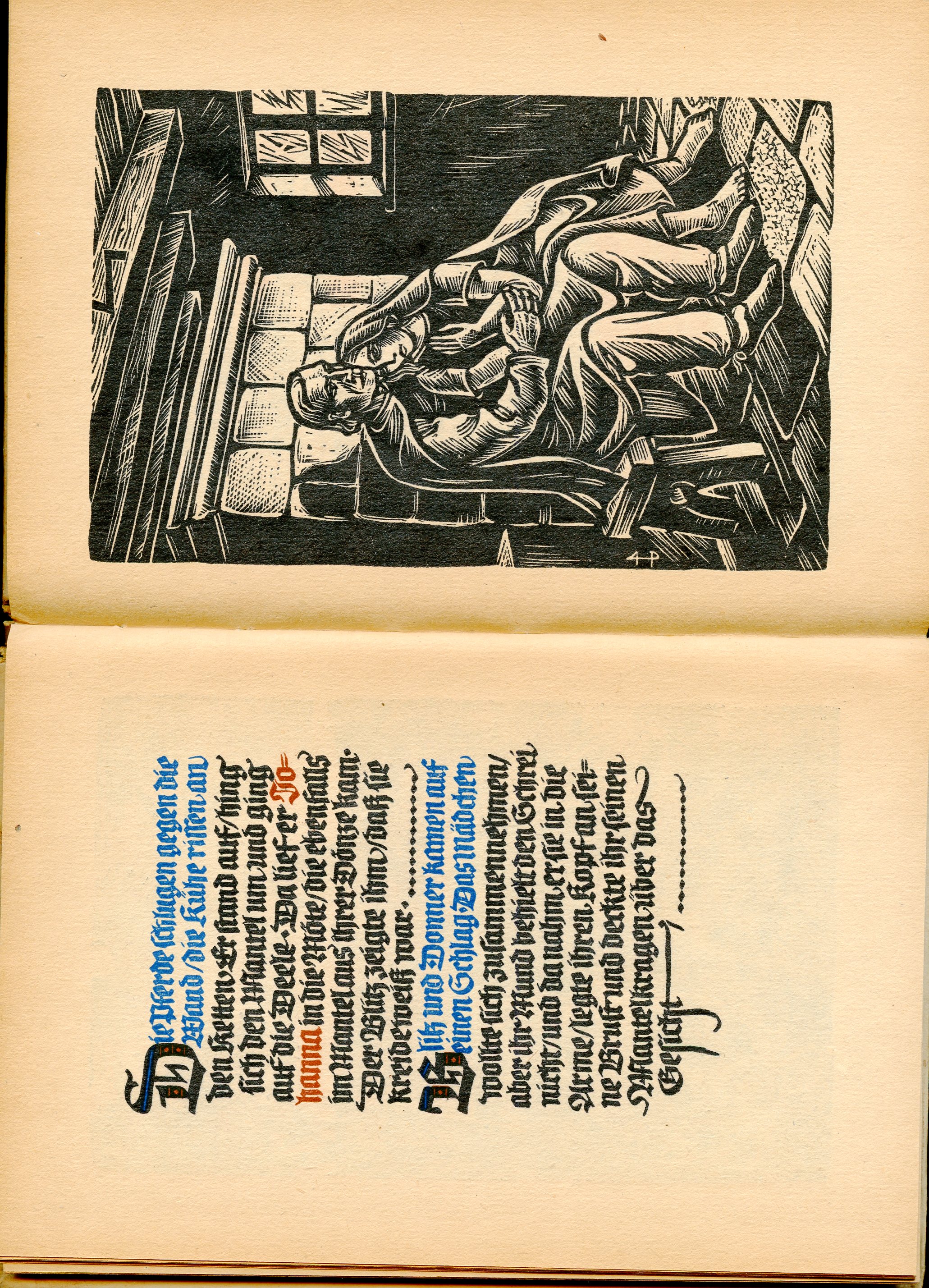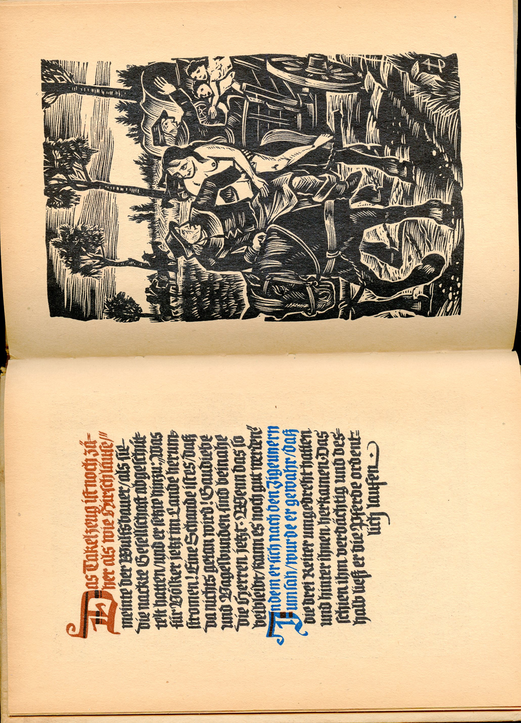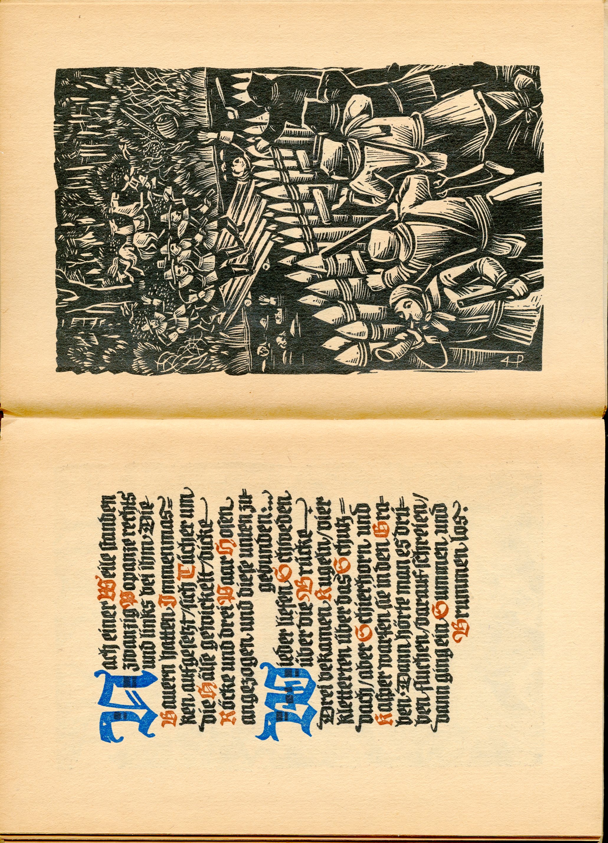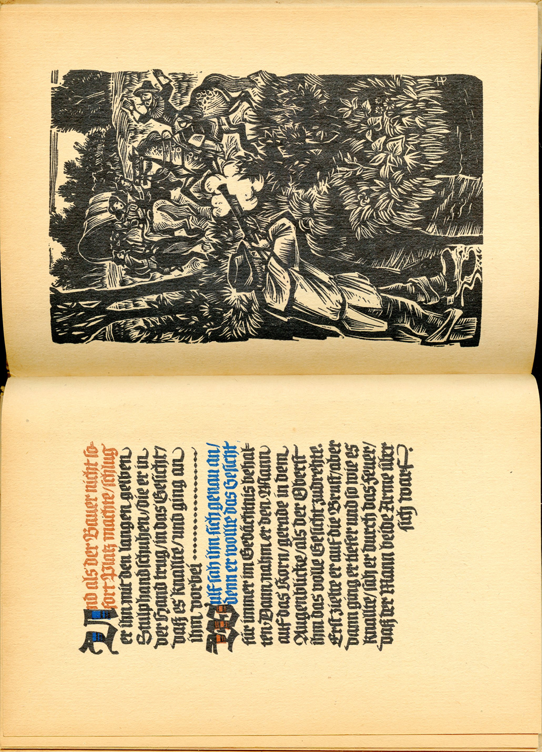 Here is the rare 1942 National Socialist edition of Der Wehrwolf, by Hermann Löns (1886-1971) 'Aus der Bauernchronik Der Wehrwolf von Hermann Löns - Eine Holzschnittfolge von Hans Pape' (From the peasant chronicle The Wehrwolf by Hermann Löns - A woodcut series by Hans Pape), 1942, Eugen Diederichs Verlag, Jena. Printed in Fraktur (German blackletter typeface or font), 44 pages, 5 x 7 inches. This edition features seventeen woodcuts by the superb German artist Hans Pape. Below you will find the PDF and very large JPG images in case the reader needs to use any of the images.