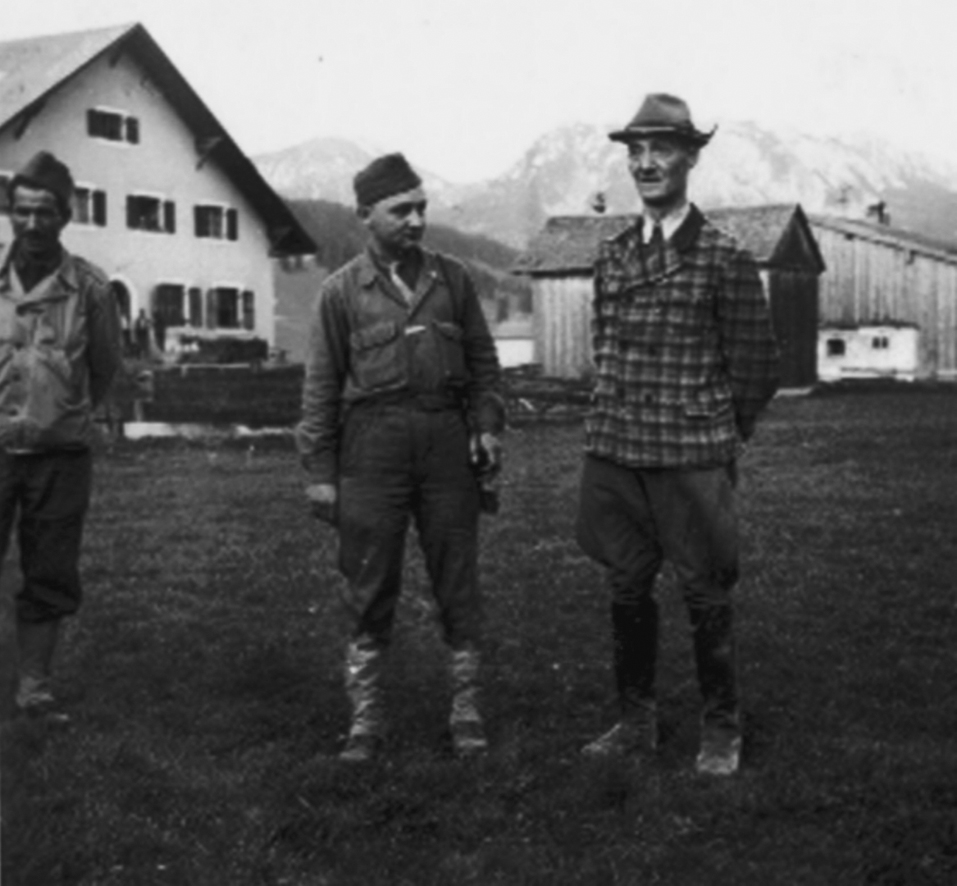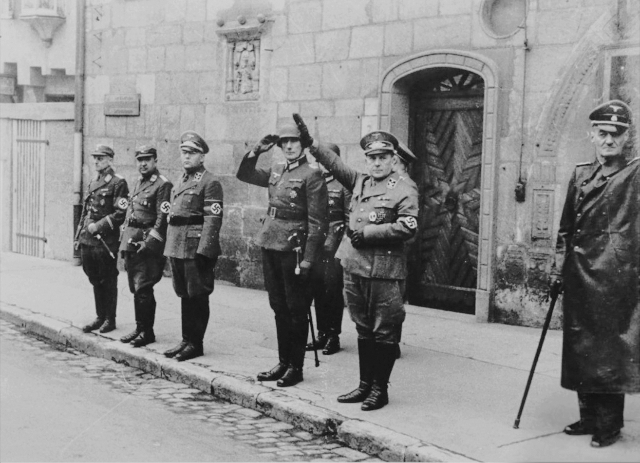 [Above: SS-Obersturmbannführer Oskar Dirlewanger (right) standing next to a group of NSDAP officials at a parade near Kielmeyerhaus, Germany, December 1943. Dirlewanger was still recuperating from a gunshot wound to his chest, received during anti-partisan operations in Belarus. Note his cane and he is saluting with his left arm.]