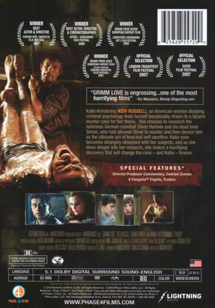 [Note: Directed by Martin Weisz. The craziest thing about this movie is the story it is based upon. Basically one person posts a message wanting to be eaten alive. Another person wants to eat someone. True love. Internet + humanity = some truly disturbing stuff. This movie starts out slow, but gets better as dinner time grows near...! HA! Oh, and did I mention the one who wants to be eaten had one small request? It was that the other first bite off his penis, cook it and serve it to him!]