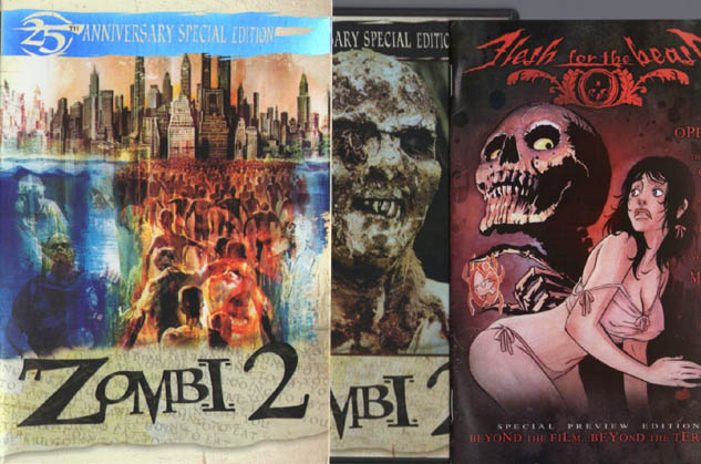 [Note: OK, this can get confusing. Here are some various releases of the cult film Zombie. The first three shown are the same film, with different features and versions, despite the fact the third one above is called Zombi 2, which was its European title. It also is a two disc version which includes a comic book, shown above, of an upcoming movie. The third Zombie, 'Zombi 3' without the 'e' is also directed Fulci but with the help of Bruno Mattei. The fourth Zombie is not directed by Fulci and is directed by Claudio Fragasso. Get all that? Well, anyway, the original Zombie is a killer movie. The confusion with the Zombie name came when Dawn of the Dead was released in Europe. For some reason they renamed it 'Zombi.' To cash in on the name, 'Zombi 2' was released, but it is really Zombie 1, and 'Zombi' is really Dawn of the Dead. Err... now even I am getting confused! hehe... Check out the example below.]