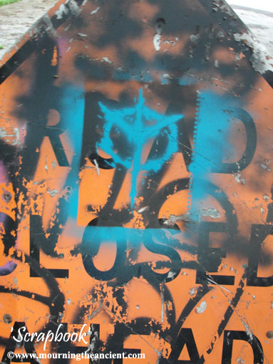 [Check out this odd stenciled graffiti. How odd to be found here, among this decay and ruin, since it is the ancient symbol of renewal]