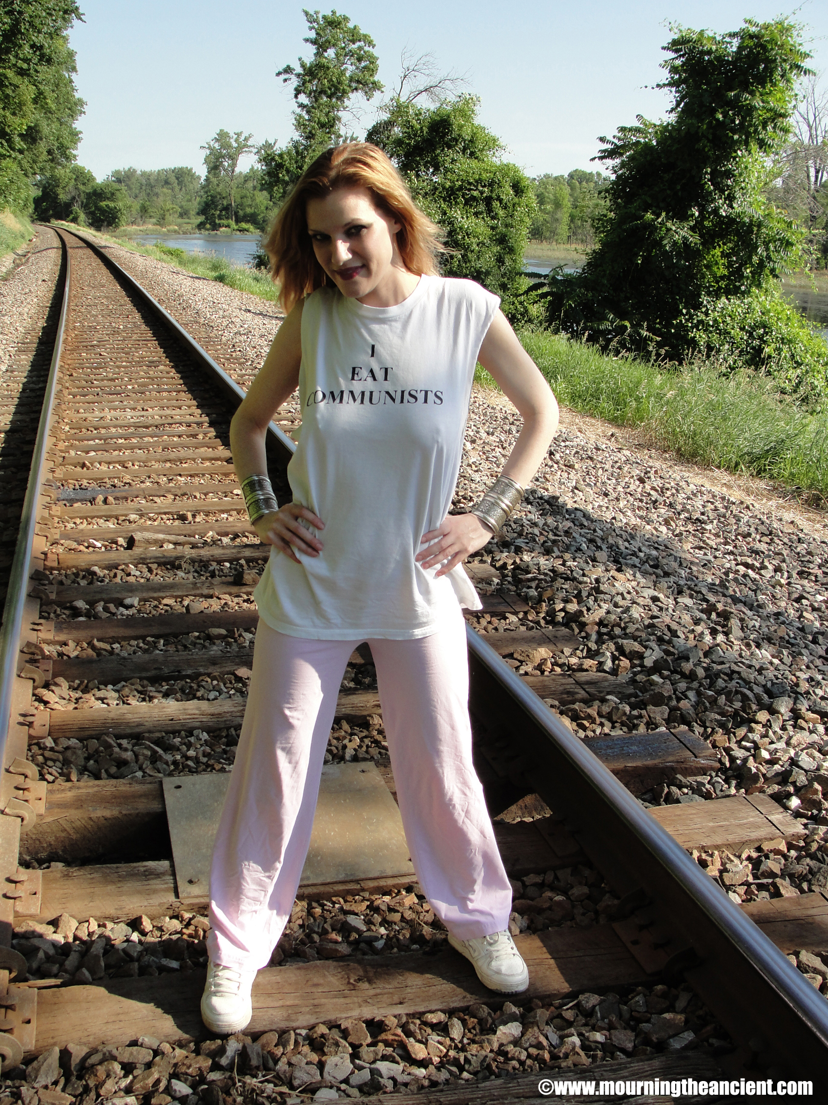 We did this shoot at a forest, which after many rainy days and nights, was a flooded mess. Thus, we had to walk the railroad tracks which cut through the woods. After a few miles in the hot sun looking for a suitable entry point into the trees, and finding none due to the flood, we decided to do the shoot on the side of the railroad tracks. Beside the tracks was a rather perilous gravel slope which led to the water. If having to stand on this wasn't hellish enough, we also had to contend with heat in the nineties and mosquitos, not to mention three passing trains! You'd never know it from the tranquil look of the photos, but in some of them the train was speeding behind us, not more than fifteen feet away. In some shots you can even see hair blowing from the train's force!