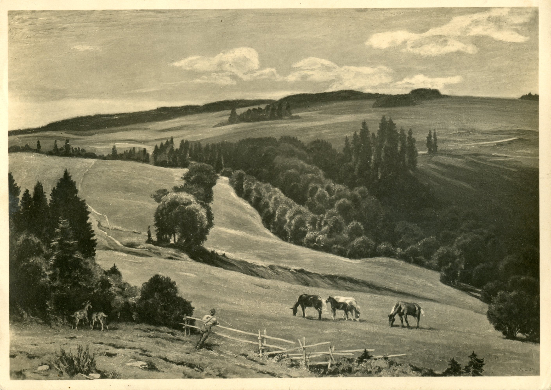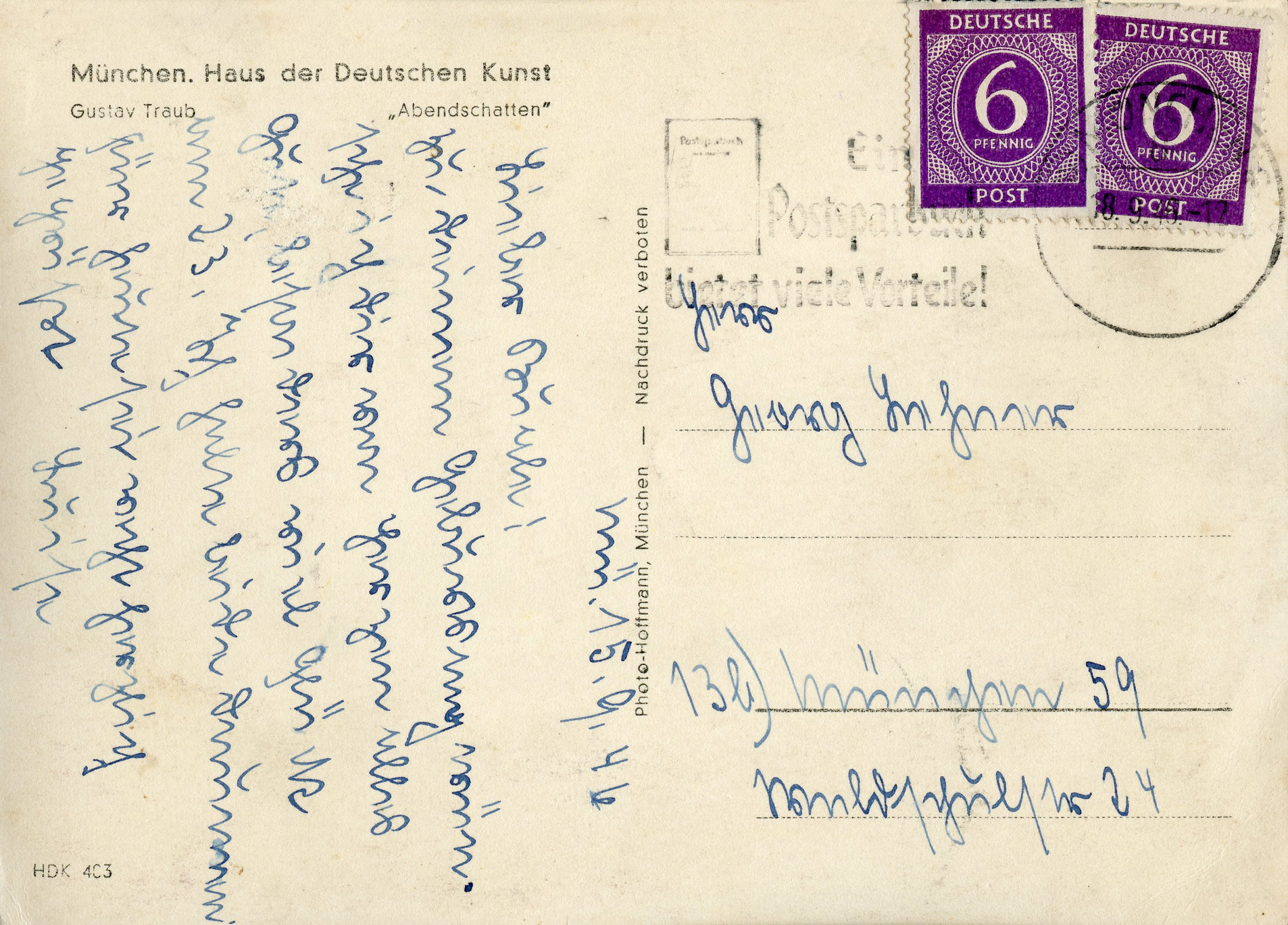 [Below: Postcard variation - used and canceled on September 18, 1946. Interesting that they sent this right after the war in occupied West Germany. Front.]