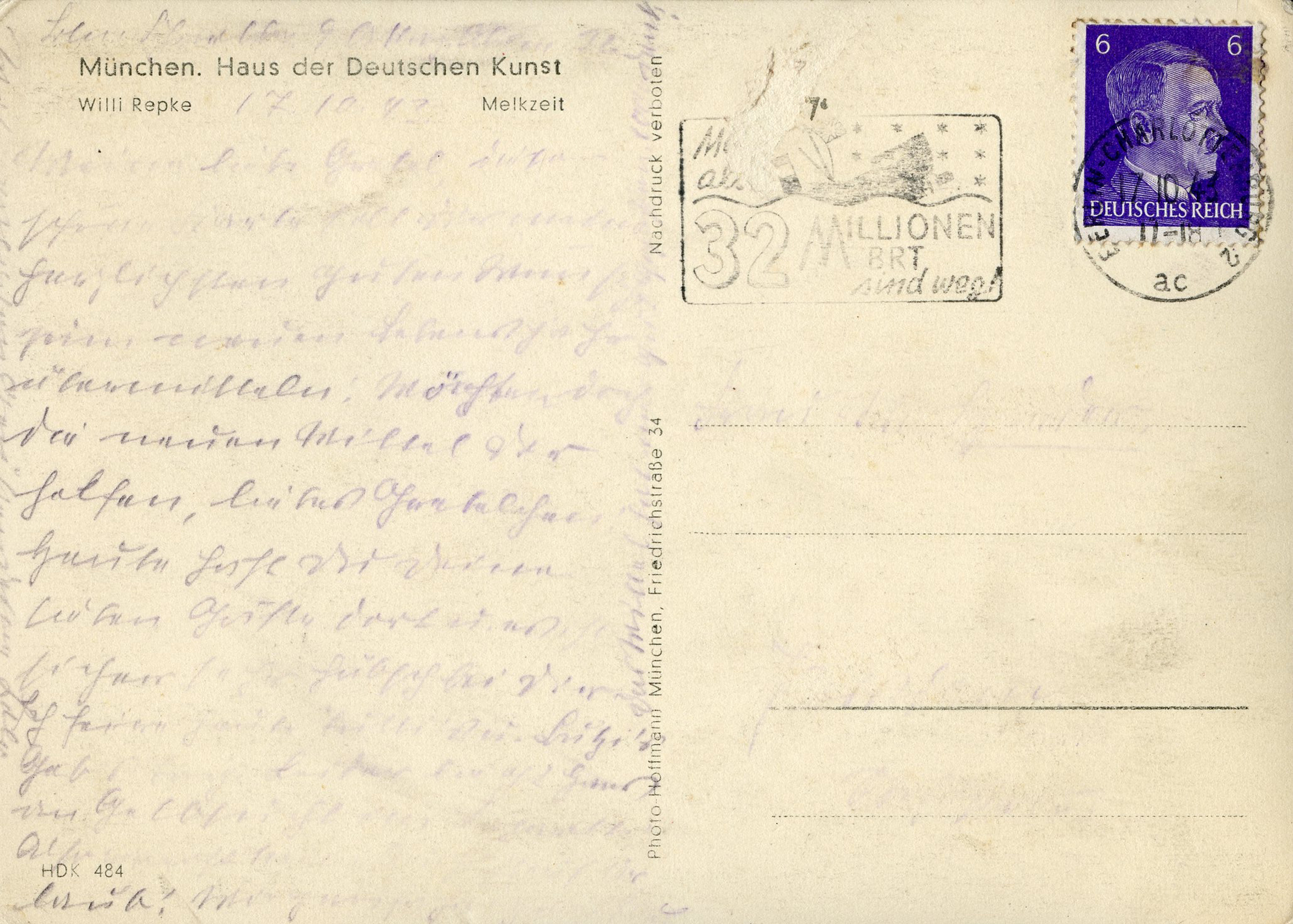 [Below: Postcard reverse. Used version, canceled October 17, 1943.]