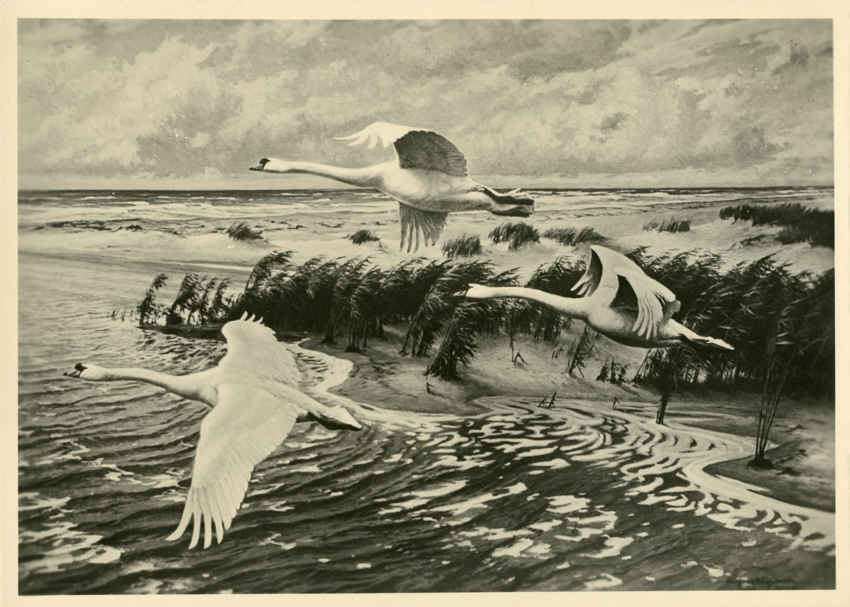 [Above: This was done by the artist Karl E. Olszewski, from Munich, entitled 'Höckerschwäne über dem Haffwinkel' (Silent Swans Over the Haffwinkel).]