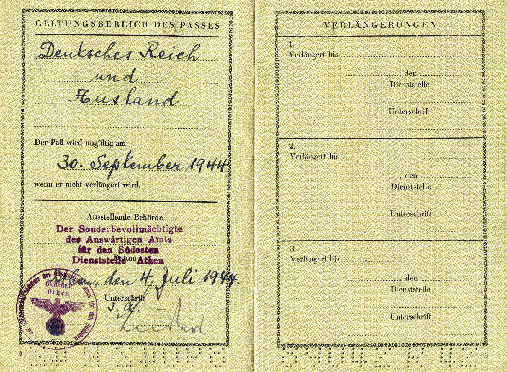 [Below: This looks like it was an entry into the Vienna airport, with permission to cross over the borders of Bulgaria, Serbia, Croatia, Hungary, Slovakia, Bohemia and Moravia (Czechoslovakia)and return to Greece. It's interesting how he had some very wide-ranging permissions during late wartime. For such a tight grip on journalism, they tell us that Germany had, they sure did let reporters travel very freely.]
