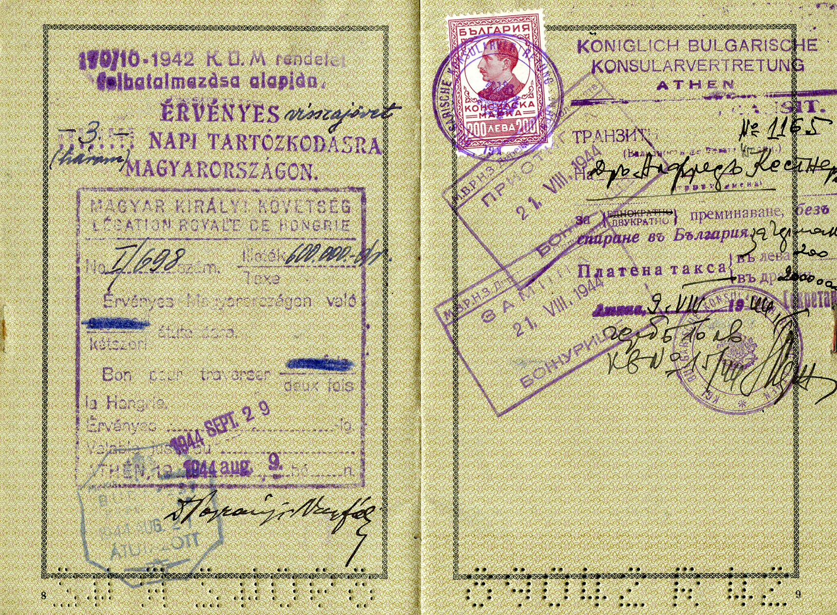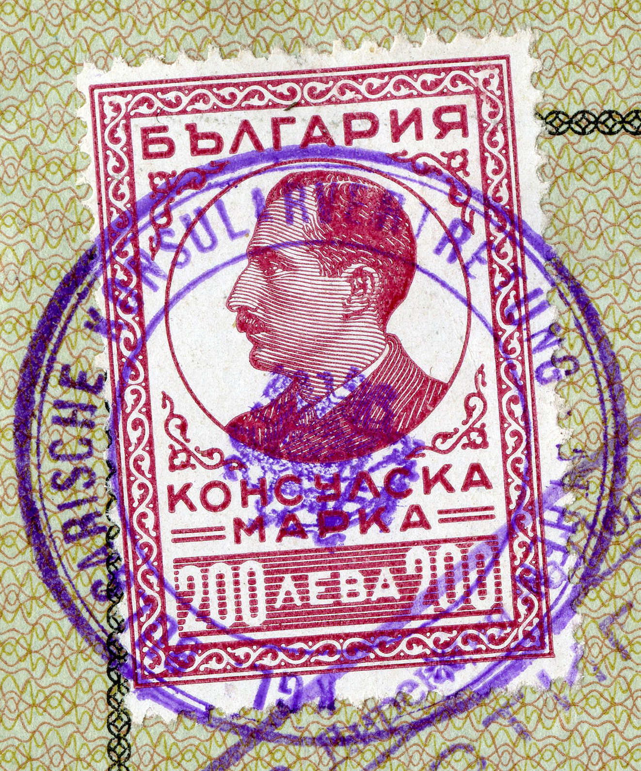 [Below: This page of his passport shows he traveled in August/September 1944 to Hungary (left) and Bulgaria. This also shows an interesting Bulgarian tax stamp.]