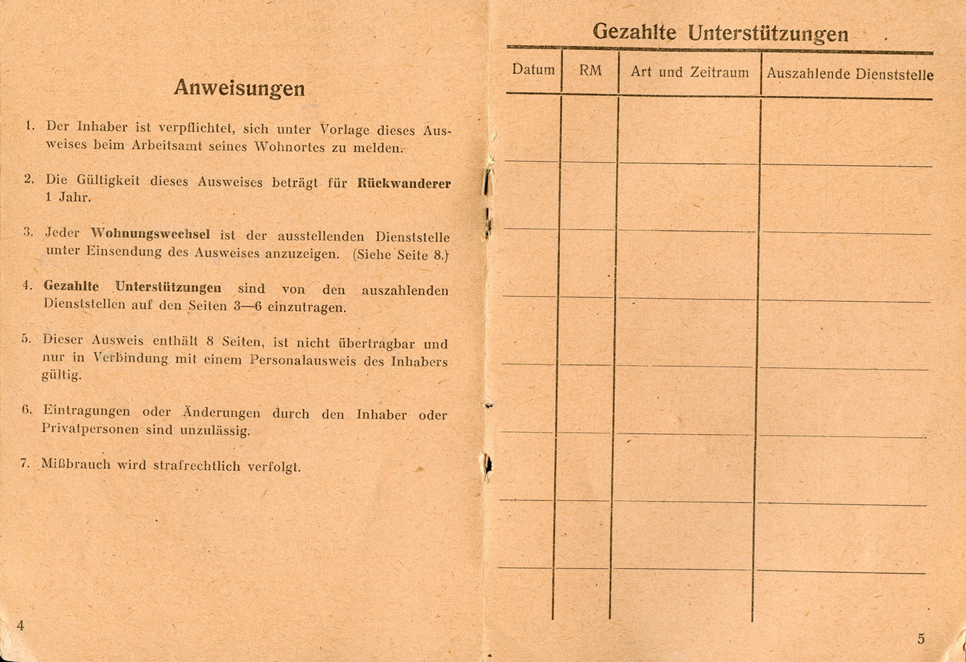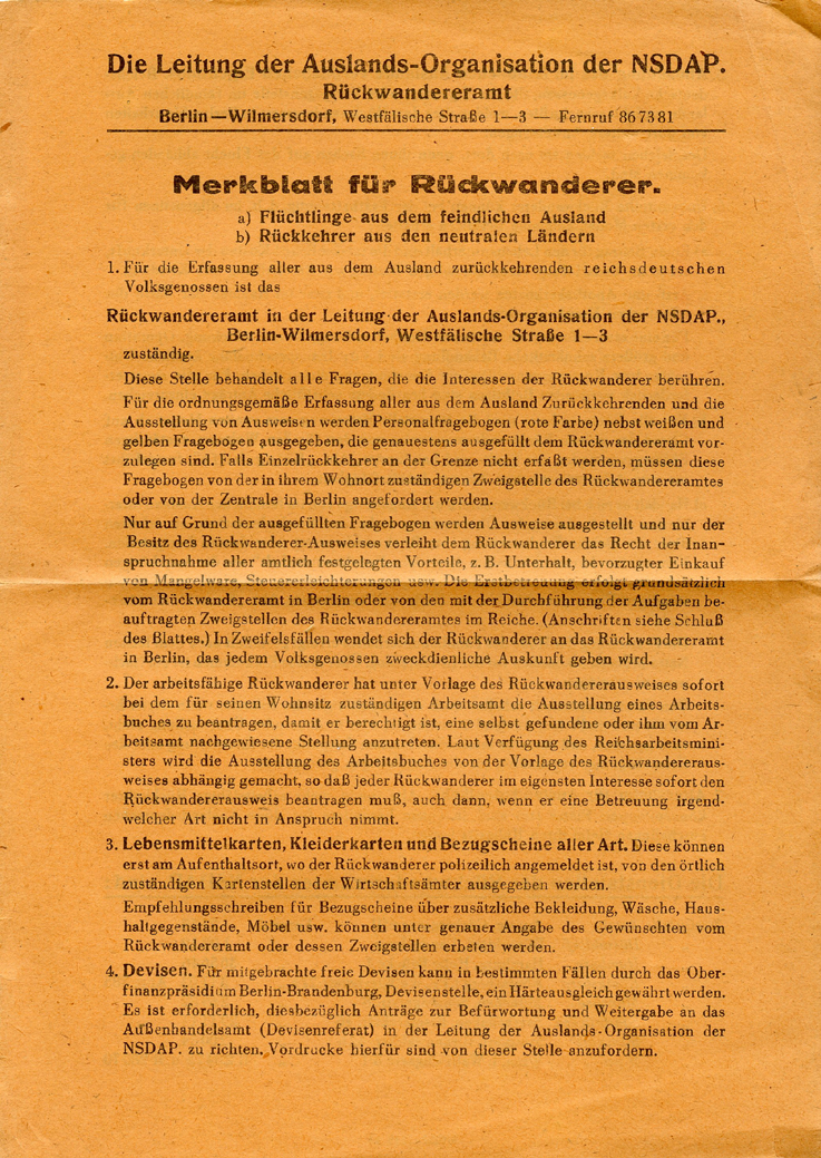 [Below: This sheet is also from 'The Management of the Foreign Organization of the NSDAP Returnees' Office', based in Berlin. It is entitled 'Information Sheet for Returnees' and is broken up as either 'Refugees from Enemy Countries' and 'Returnees from Neutral Countries'. This sheet provides information on everything from work, ration cards of all kinds, benefits like housing, initial support, help with foreign currency, etc.]