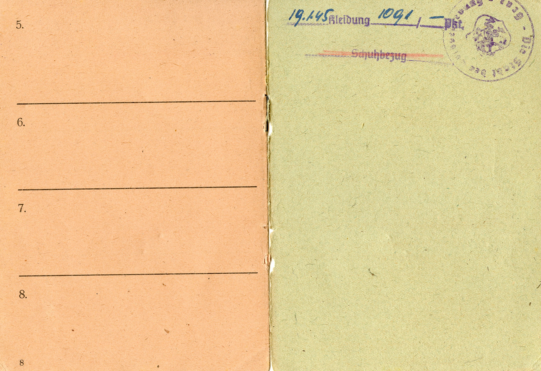 [Below: This stamp is interesting. 'Kleidung' means 'clothing' and 'Schuhbezug' means 'shoe receiving'. It has a date very late in the war, January 19, 1945. It looks like the ink stamp with the seal says Graz... so he never returned to his old home address in Hamburg. Maybe his family moved to Graz due to a war situation?]
