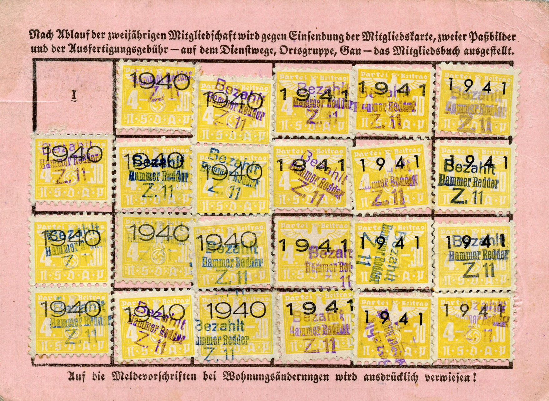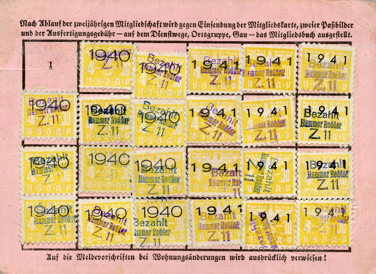 [Below: Reverse showing dues stamps from 1940-41. 'Bezahlt' means 'Paid', but 'Hammer Redder' is a mystery to me. Hmm...]