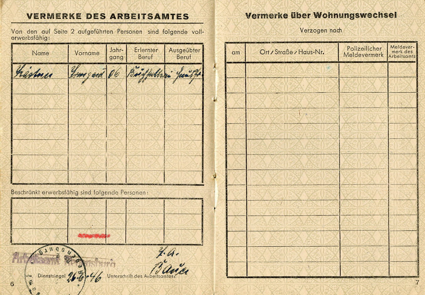[Below: Very interesting. We finally meet his wife, Franziska (but she goes by Irmgard)! But strangely this lists her 'prescribed living area' as Regensburg. Why isn't she in Hamburg? This was issued in June of 1946, but she was registered in Regensburg on August 3, 1945.]
