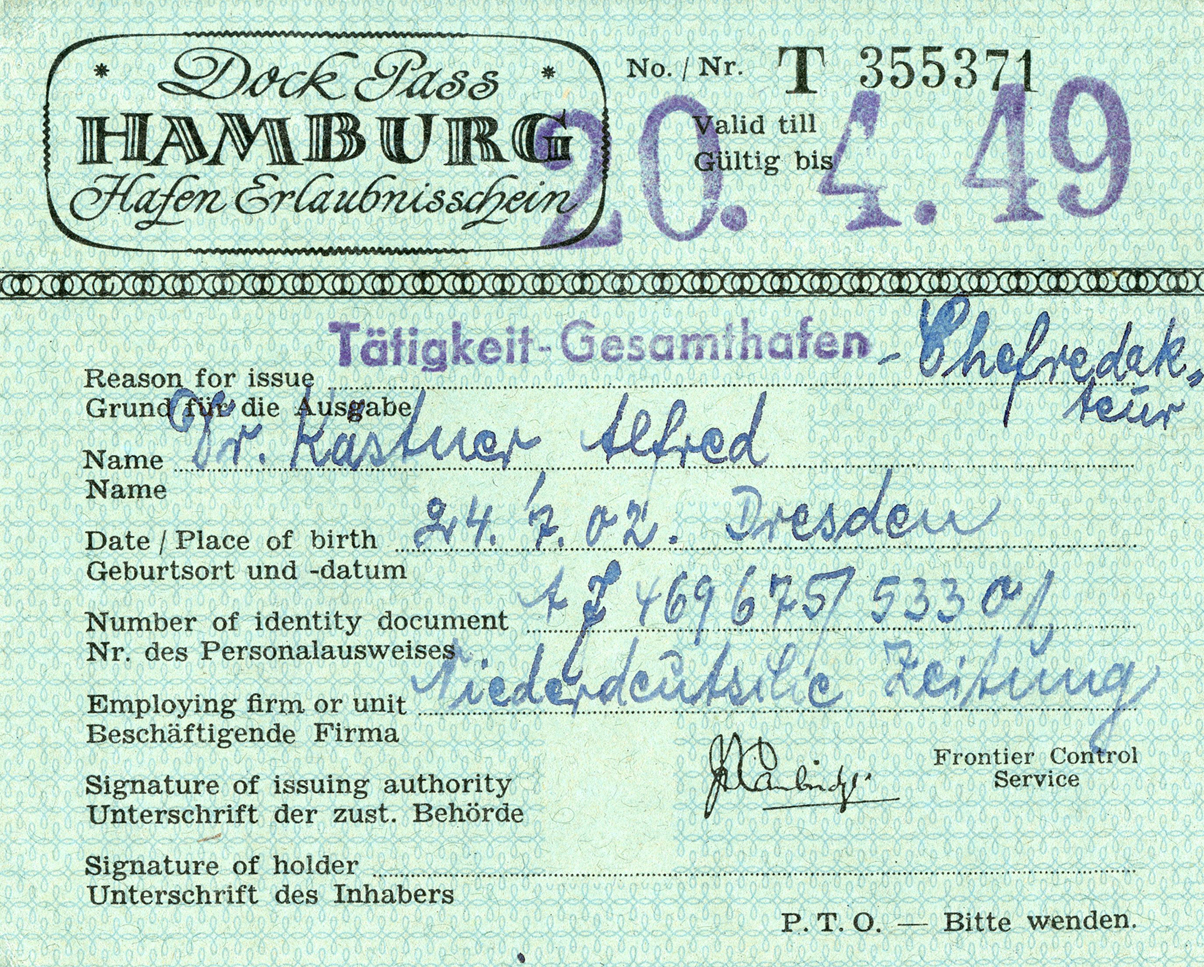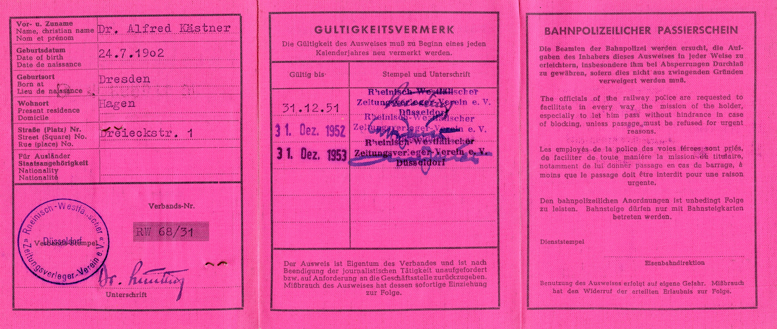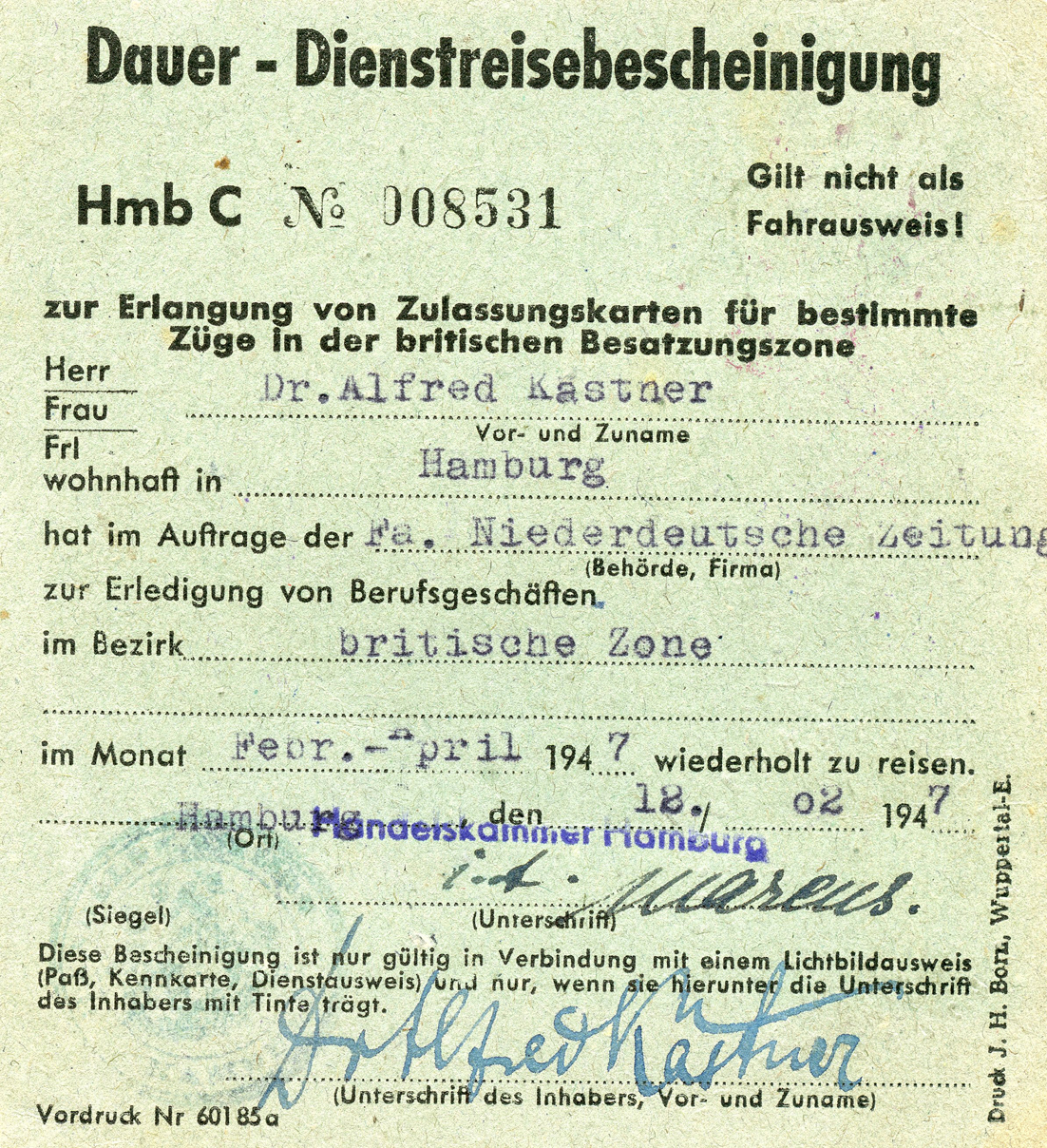 [Below: This is interesting, it says 'Permanent Business Trip Certificate' used for 'obtaining admission tickets for certain trains in the British Occupation Zone' from February 1947, to 'conduct professional business'. This lists Dr. Kästner as a resident of Hamburg, who worked for the Niederdeutsche Zeitung (Lower-Germany Newspaper).]