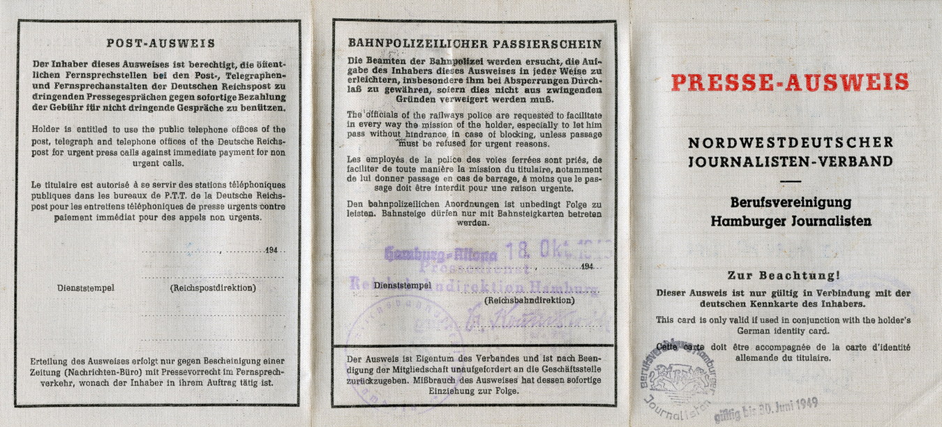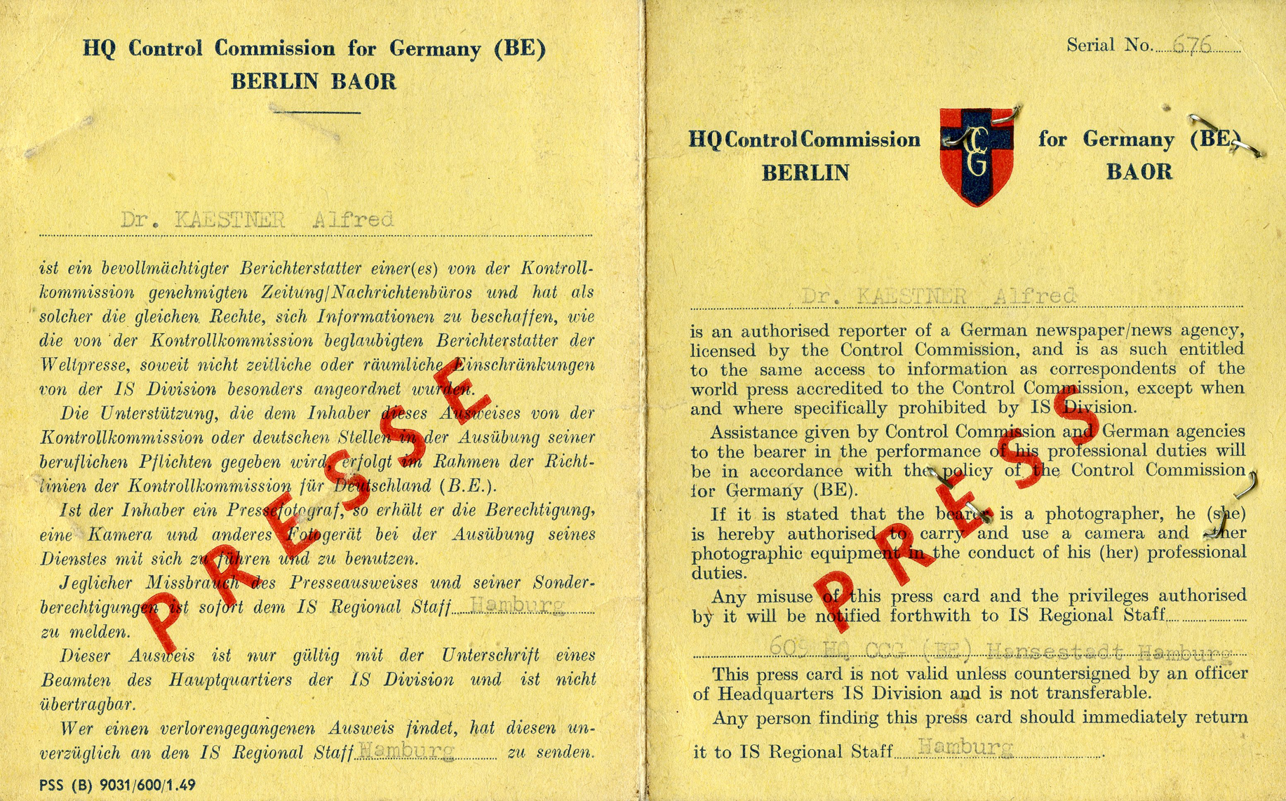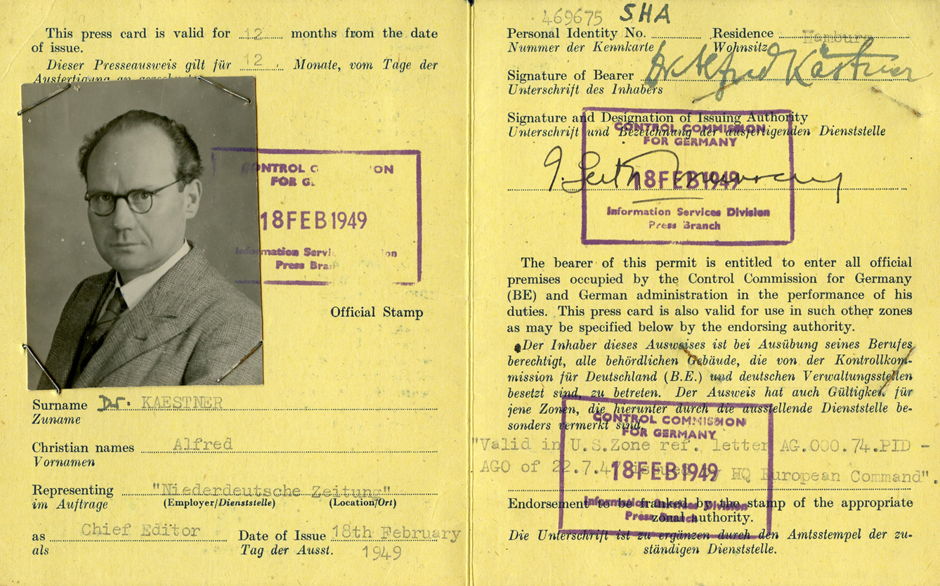 [Below: This is interesting, it says 'Permanent Business Trip Certificate' used for 'obtaining admission tickets for certain trains in the British Occupation Zone' from February 1947, to 'conduct professional business'. This lists Dr. Kästner as a resident of Hamburg, who worked for the Niederdeutsche Zeitung (Lower-Germany Newspaper).]
