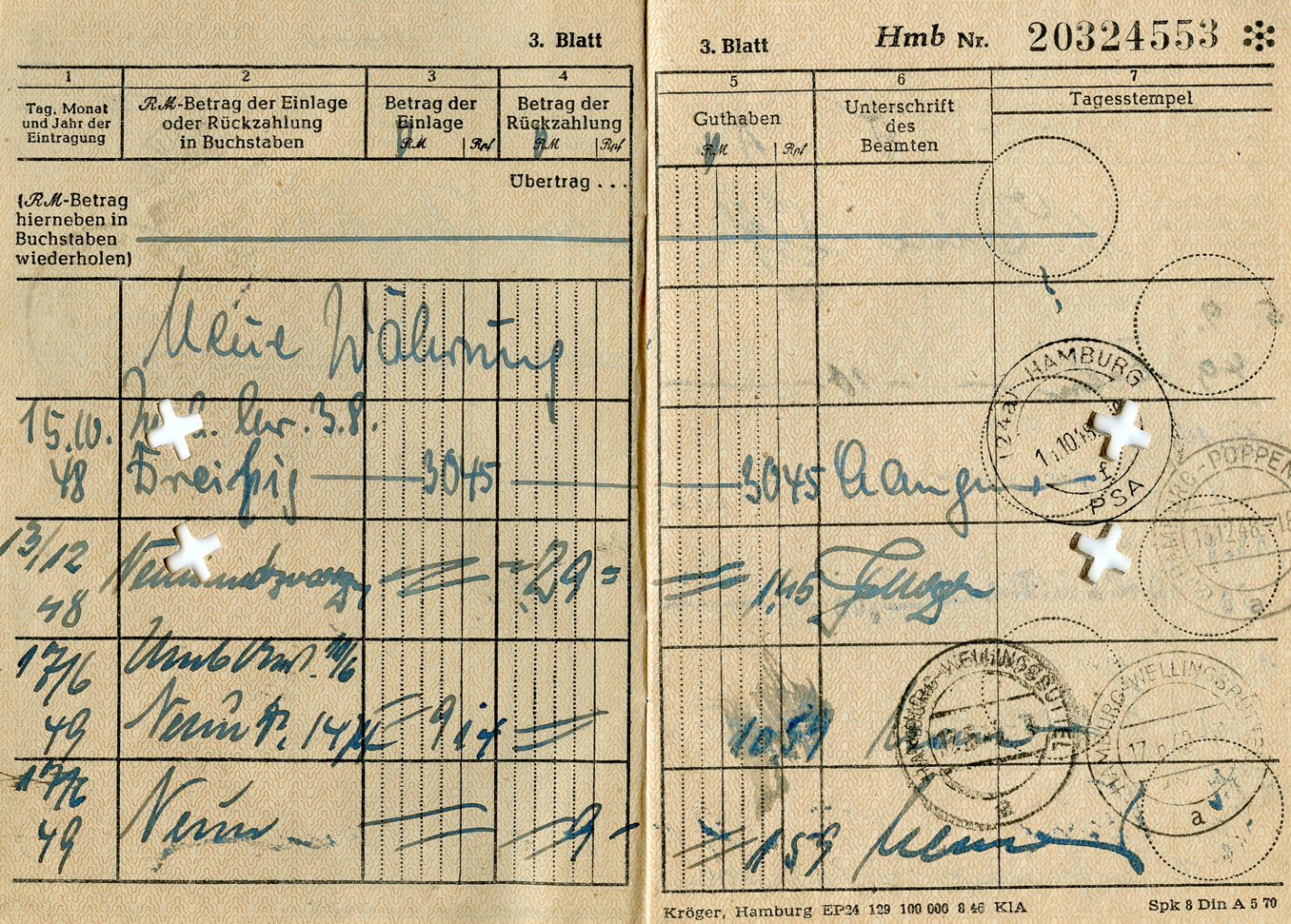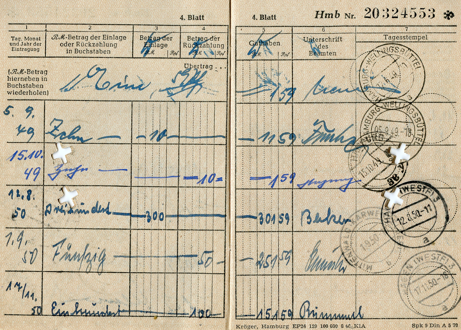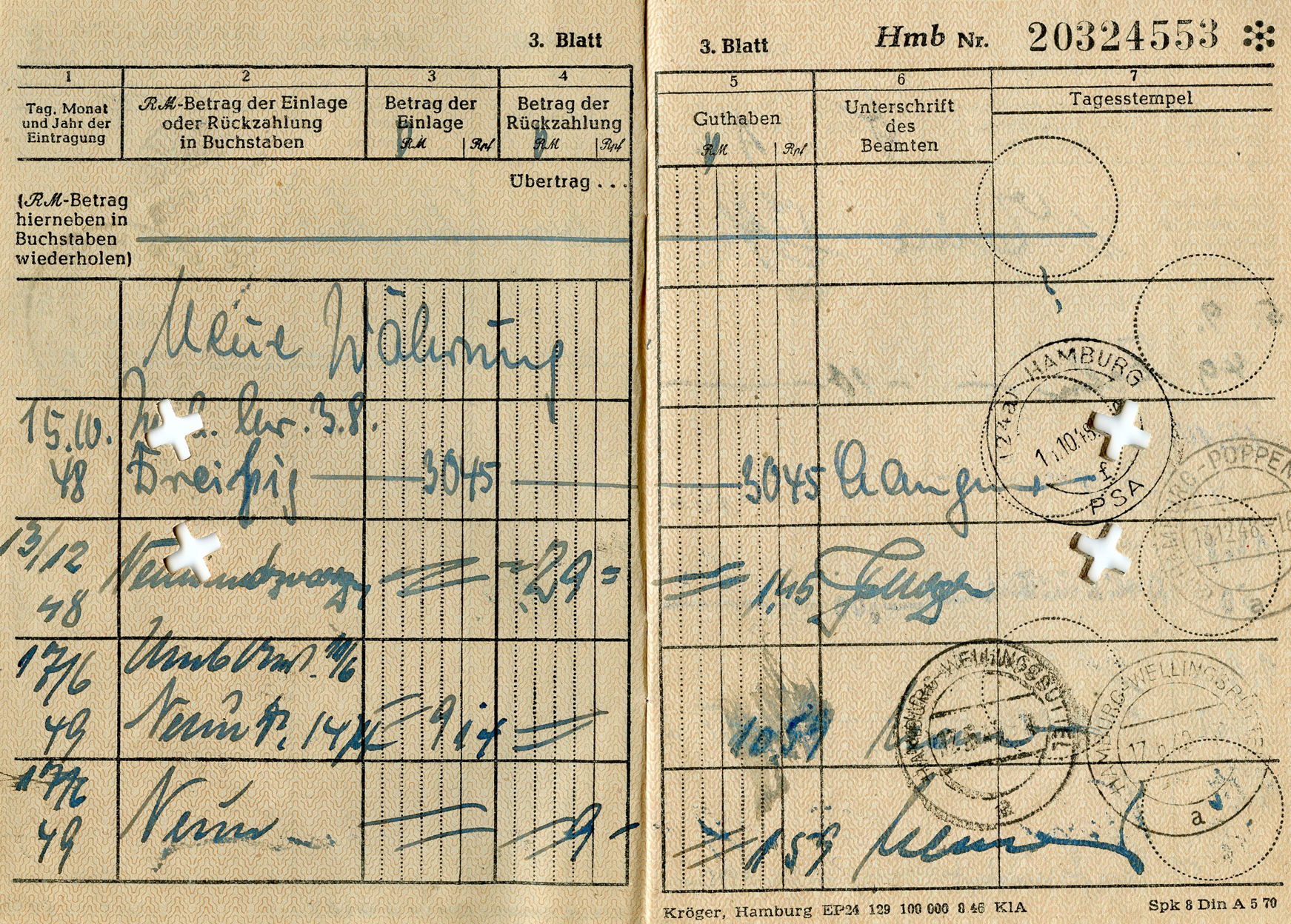 [Below: This is a Hamburg, British Zone, savings book from the Doctor's wife, Irmgard, from 1948. The account was closed on April 8, 1957.]