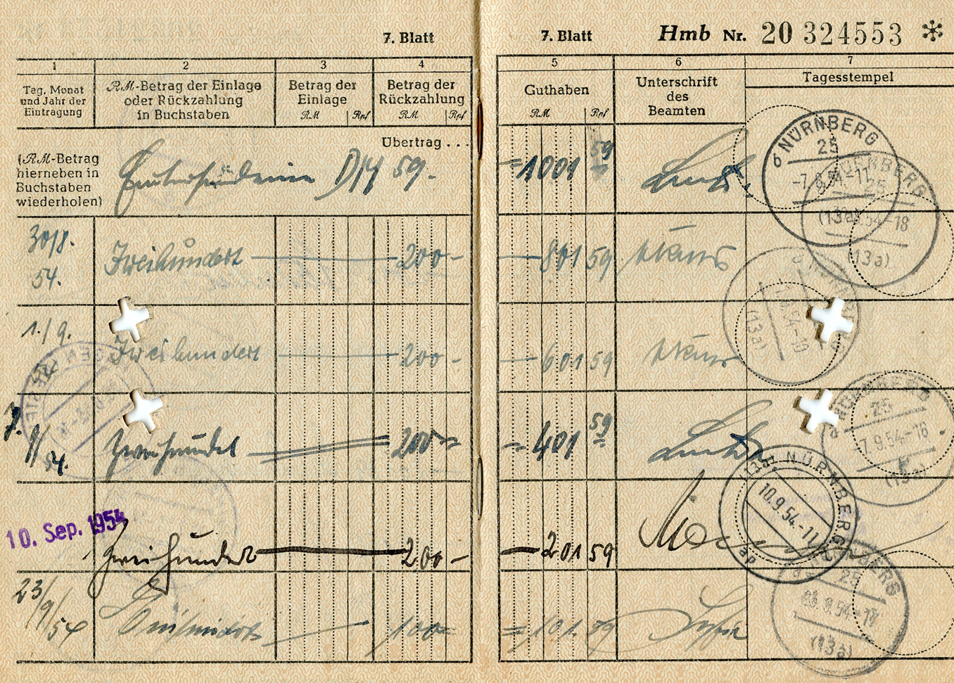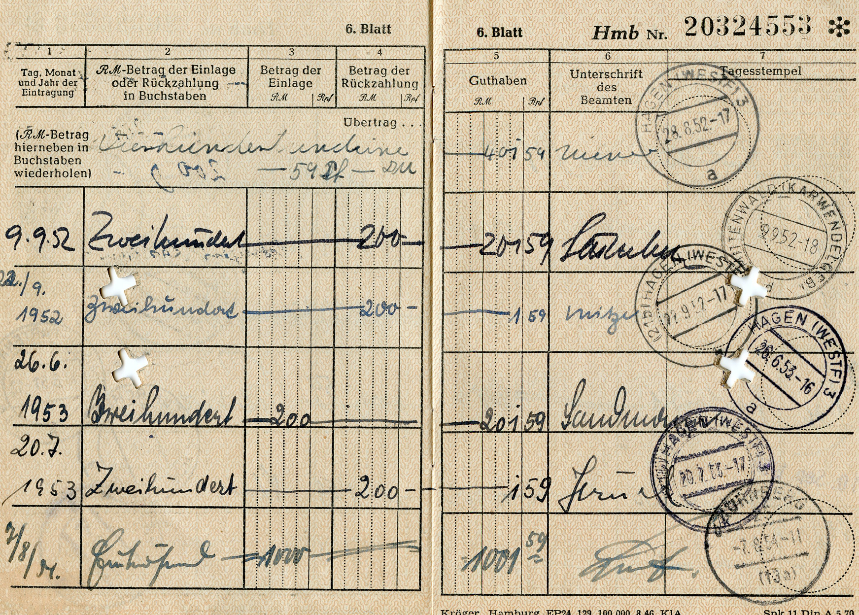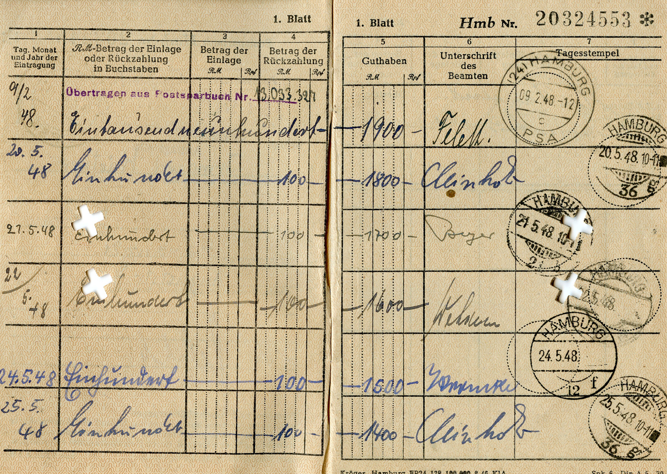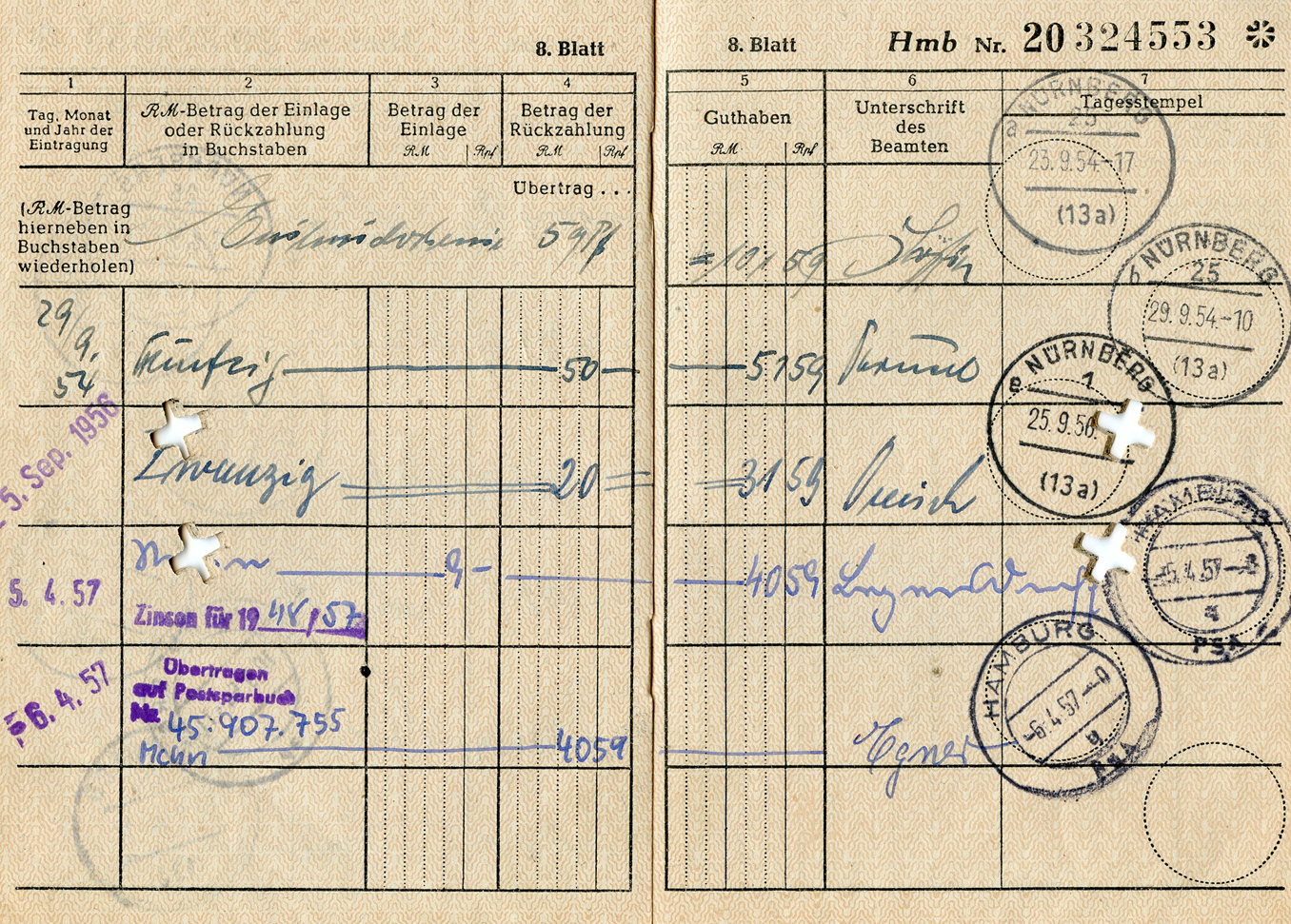 [Below: This is a Hamburg, British Zone, savings book from the Doctor's wife, Irmgard, from 1948. The account was closed on April 8, 1957.]