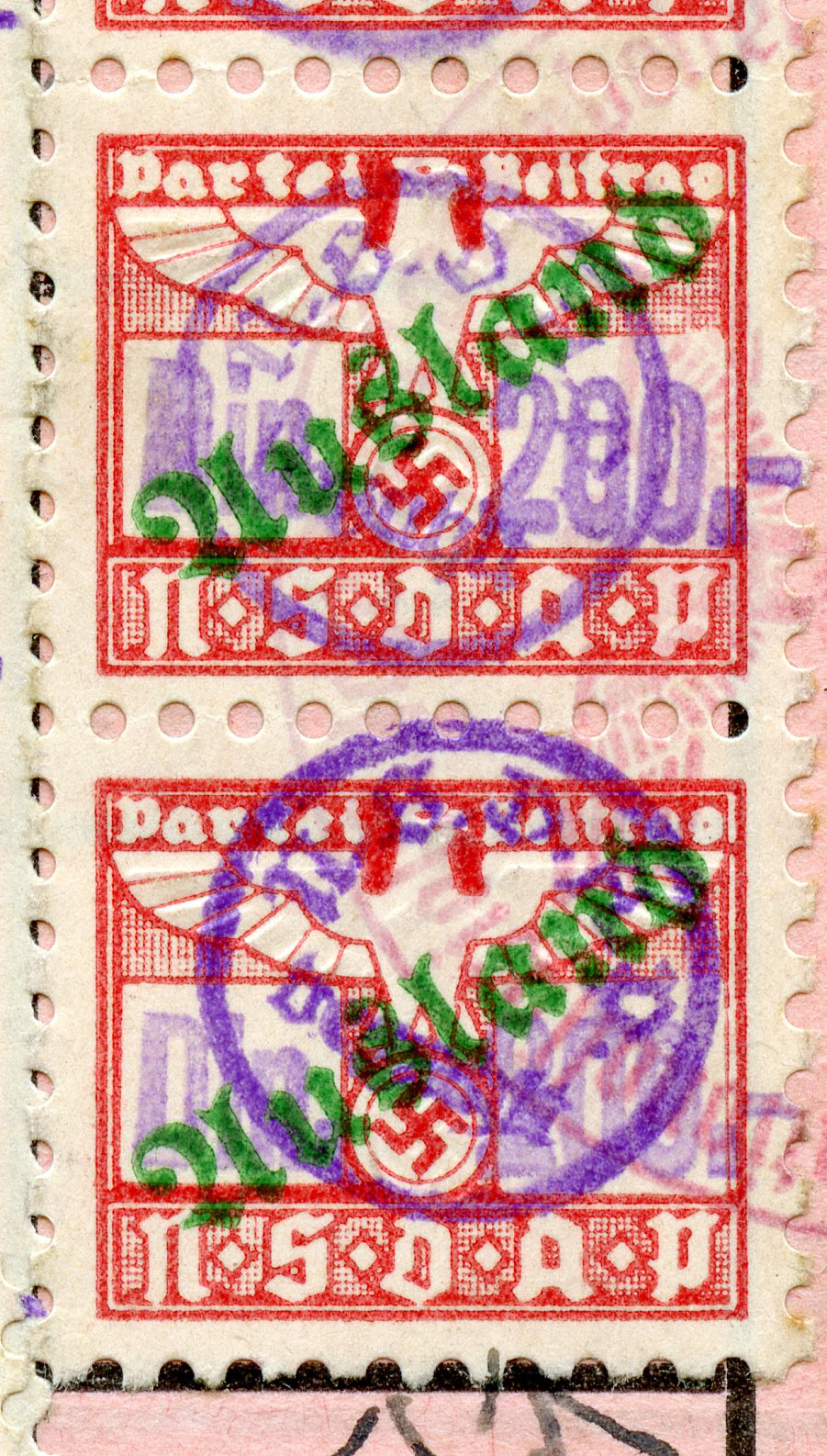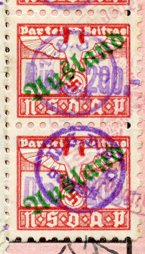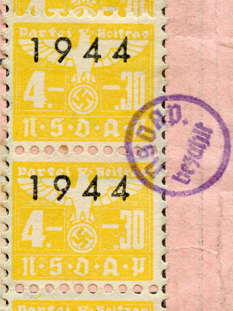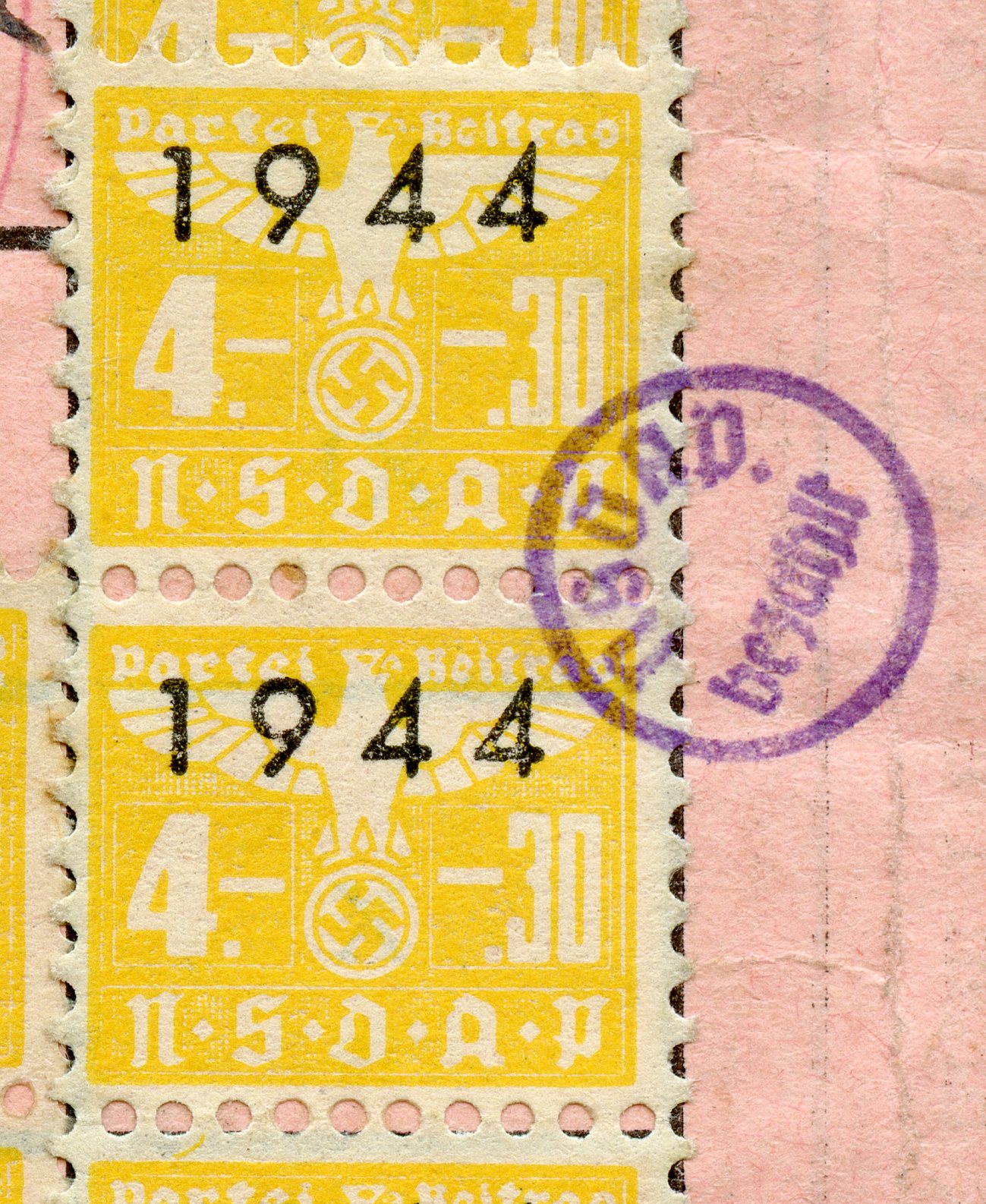 [Below: (left) Ausland dues stamps close-up. (right) 1944 dues stamps close-up. I like this little 'NSDAP bezahlt' cancel shown here.]