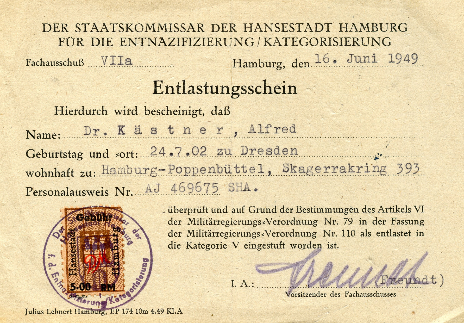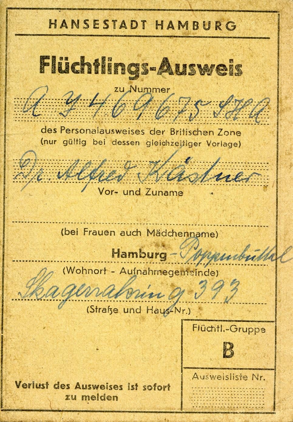 [Below: A Hamburg 'Refugee ID' card for Alfred Kästner. I'm unsure why he would still need a refugee ID card four years after the war.]