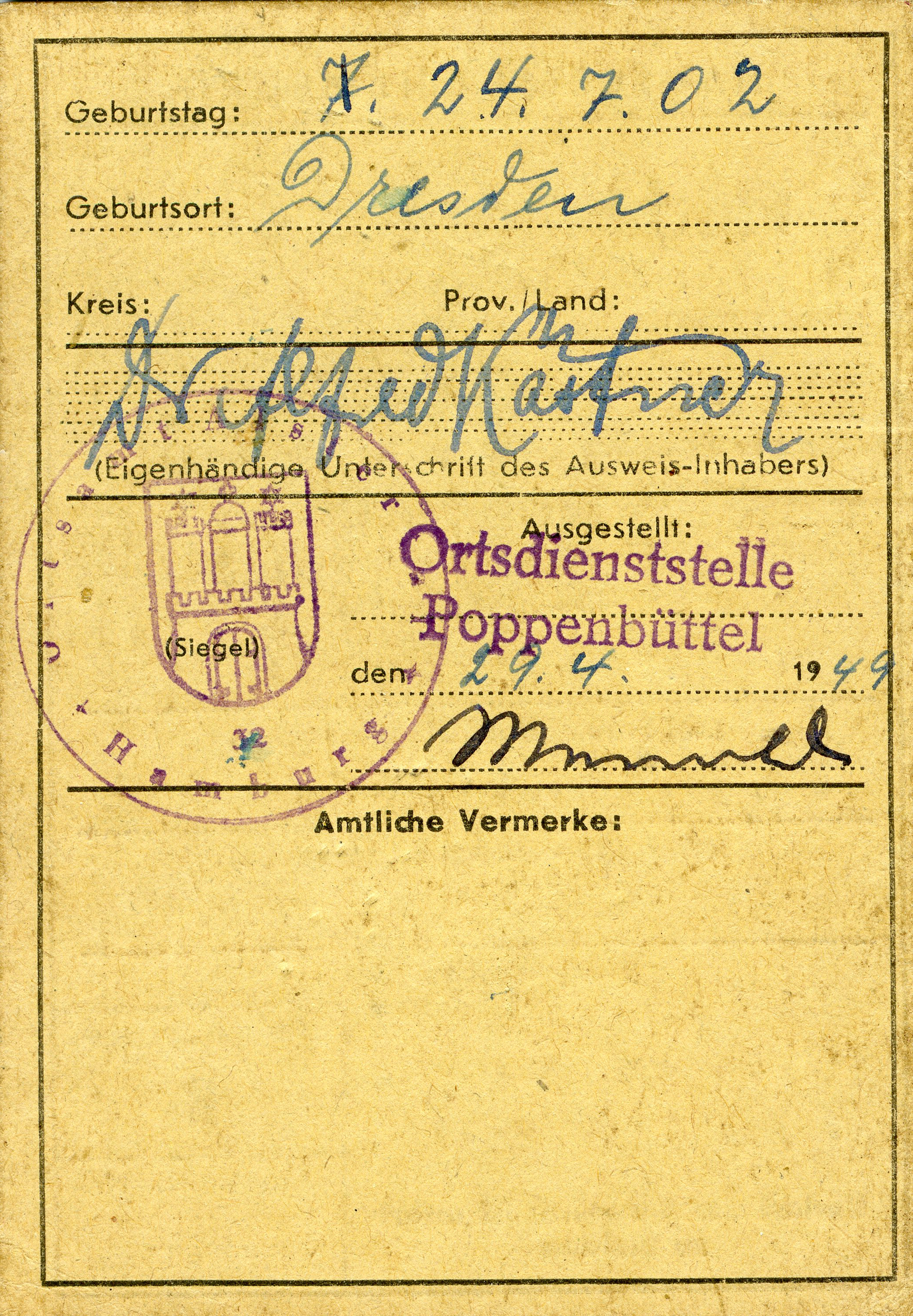 [Below: Irmgard's Hamburg 'Refugee ID' card of the same type.]