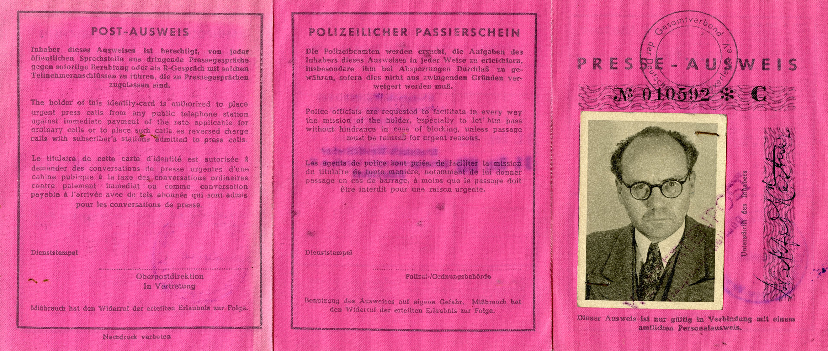 [Below: Reporter booklet issued by the Control Commission Headquarters in Berlin, February 1949. This refers to the Allied Control Council, the Allied occupation organization that ruled post-WWII Allied Occupied Germany and had its central headquarters in Berlin. This council was established by the Potsdam Agreement in 1945 and was the supreme authority for Germany, overseeing the four occupation zones.]