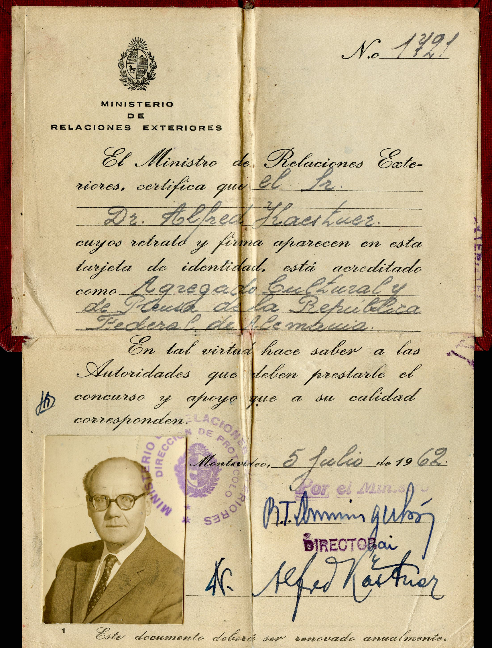 [Below: 1962 identification booklet from the Uruguay Embassy. The Doctor was a member of the press within the embassy. This shows the ID book and folded down paper from the inside.]