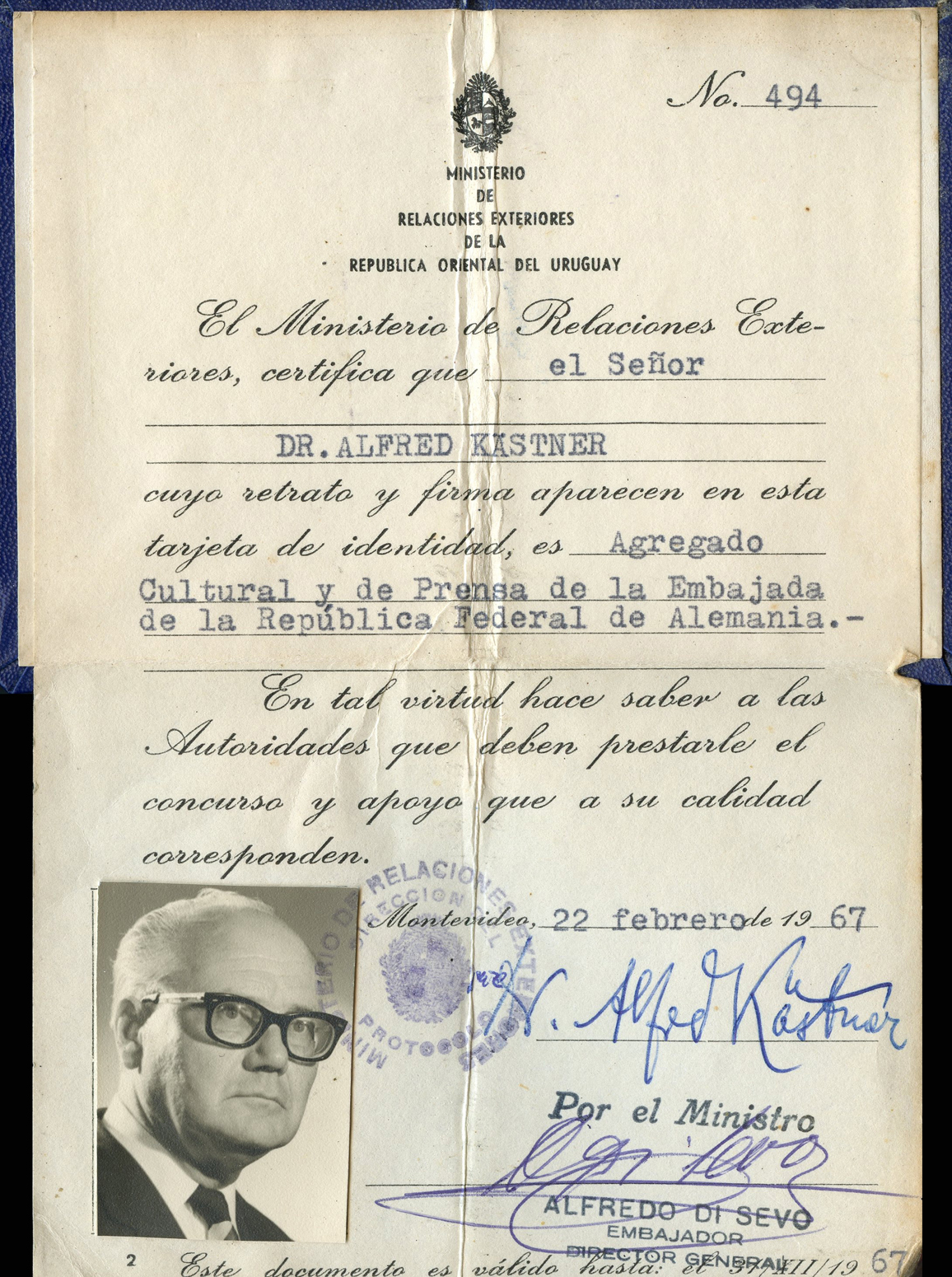 [Below: 1967 identification booklet from, again, the Uruguay Embassy. This shows the ID book and folded-down paper from the inside.]