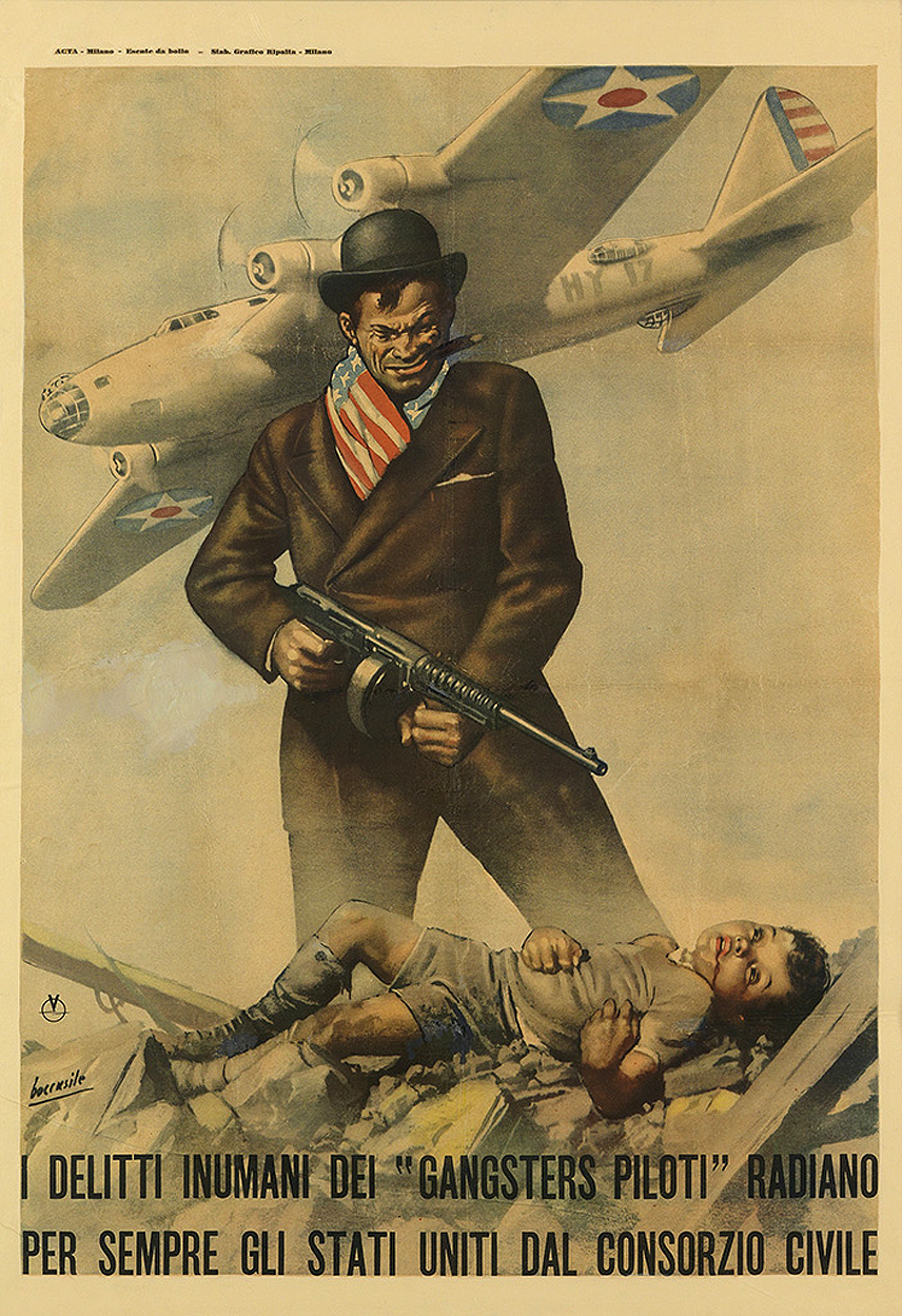 [Above: This Italian poster by Gino Boccasile also deals with the murderous American pilots, it says: