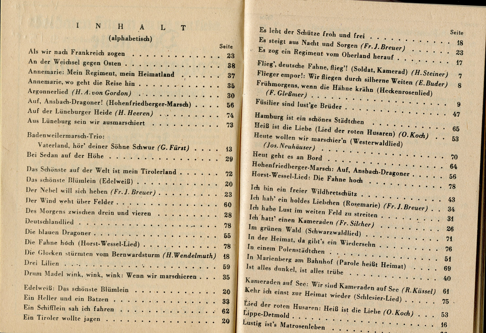 [Below: Inside of Das Neue Soldaten Liederbuch (The New Soldier's Song Book) showing Horst Wessel Lied.]