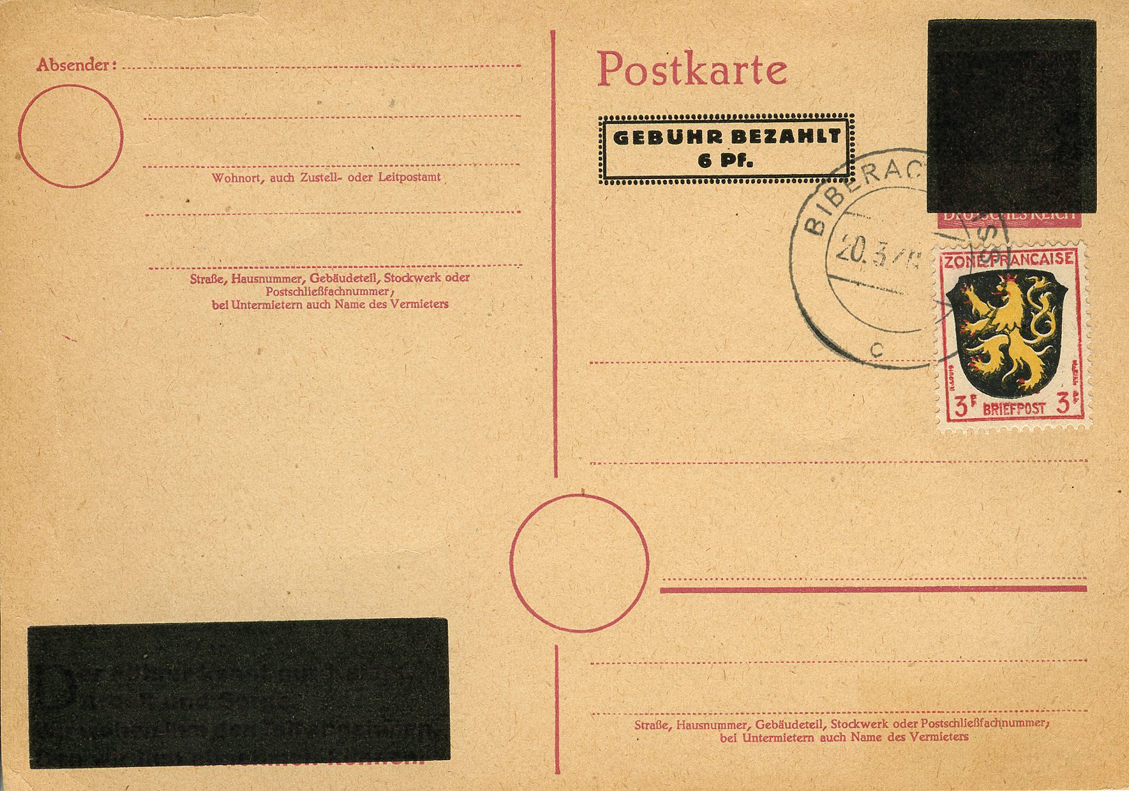[Below: Here is an unaddressed postcard with a French zone of occupation postage stamp postmarked on March 20, 1946. This postcard has a deep black Hitler head blackout stamp and a 'Gebuhr Bezahlt' (fee/postage paid) stamp. Click to see more.]