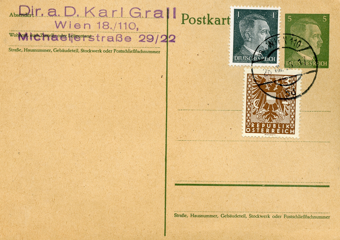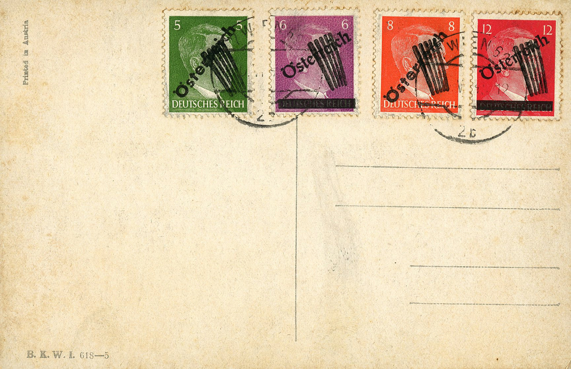 [Below: Sometimes Hitler stamps were snuck by the postal authorities, or in this case canceled but not sent. This shows an Allied occupation stamp (with a peculiar hammer and sickle design like that of communism). It was postmarked on August 28, 1945 in Vienna. Click to see more.]