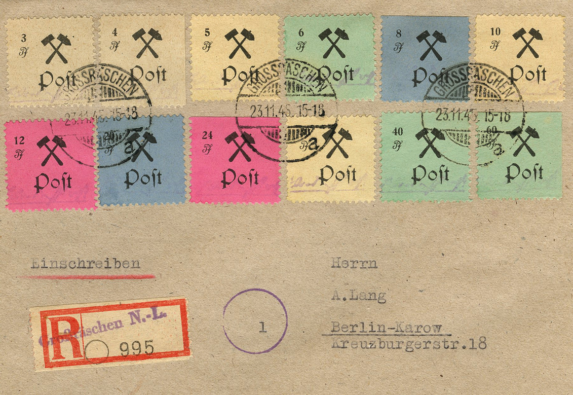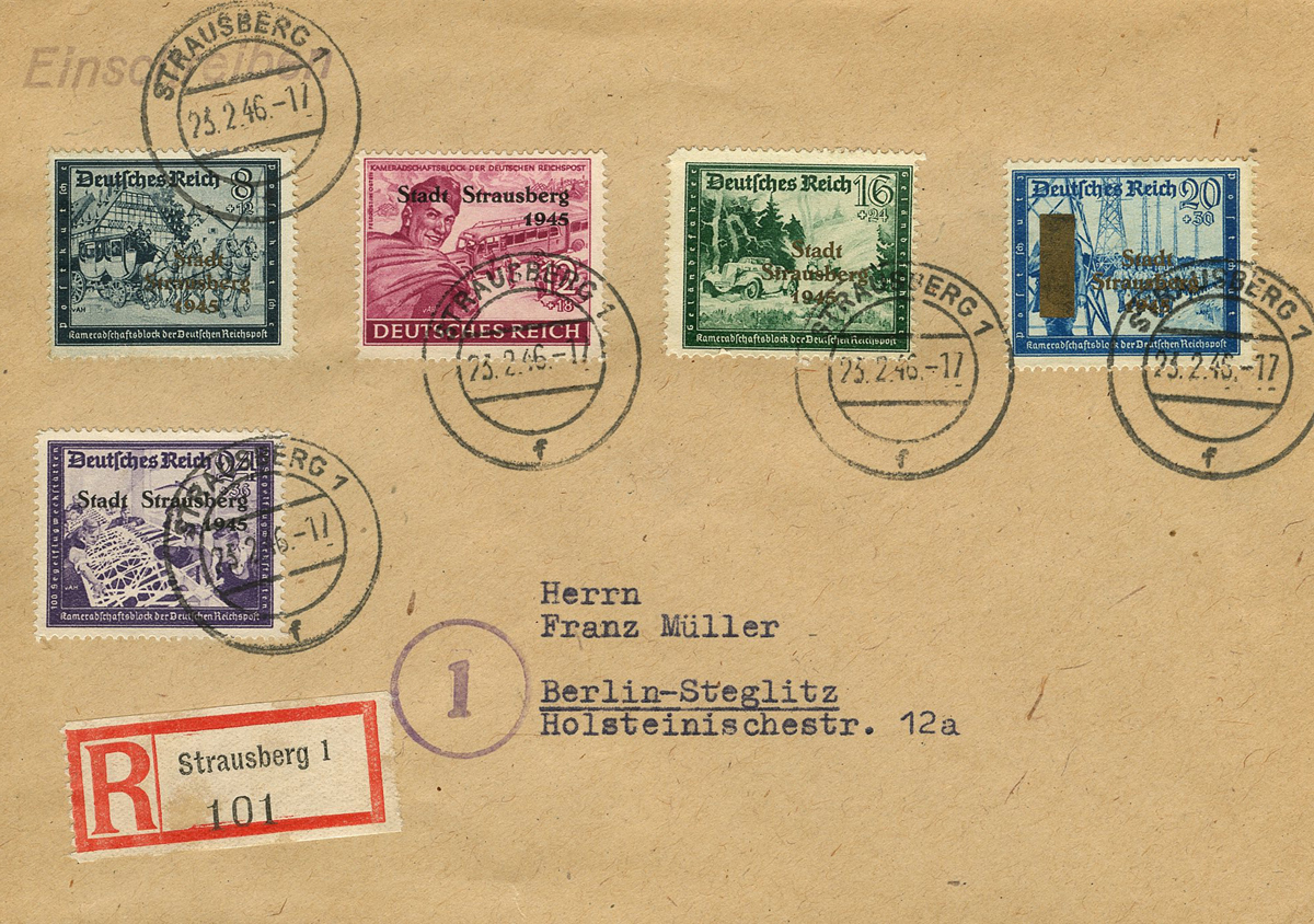 [Below: Hitler stamps weren't the only stamps the Allies tried to destroy, there were an array of verboten stamp designs. On the far right this has a postage stamp with a gold bar on it, which covers the image of a soldier. It was postmarked on February 23, 1946. Click to see more.]