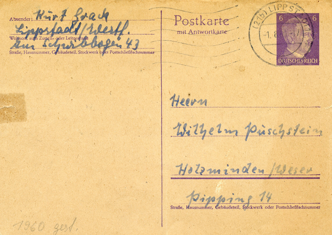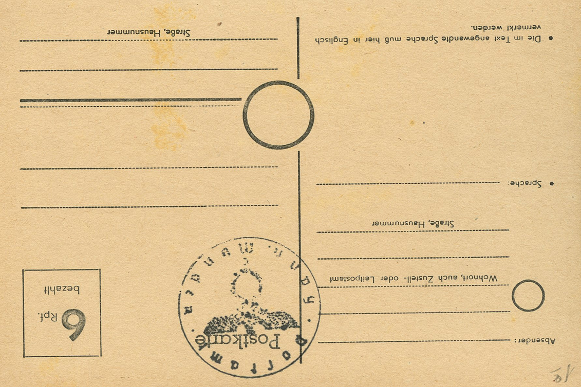 [Below: On this pre-paid (blue ink handstamp) postcard they've shaved off the entire eagle and swastika.]