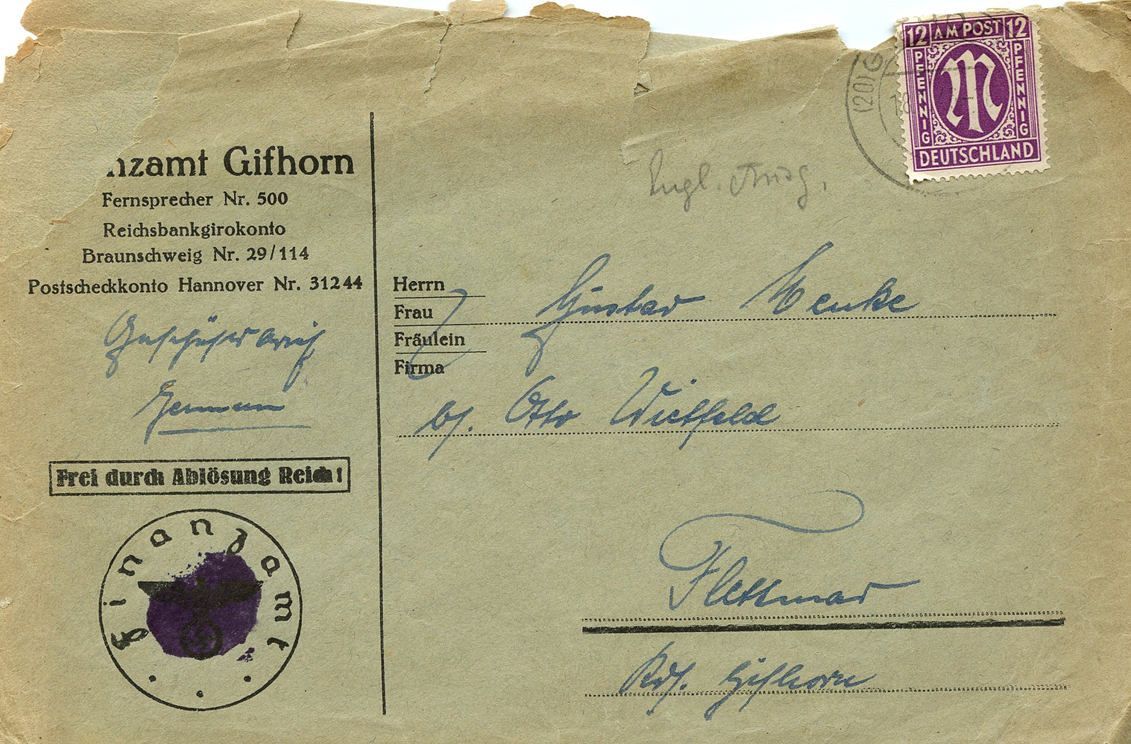 [Below: Official envelope which bore the official eagle and swastika stamp which were left over after the war. You can find many different means the Allies used to cover these 'verboten' designs. Here is a corner of tape being used, postmarked on January 17, 1946.]