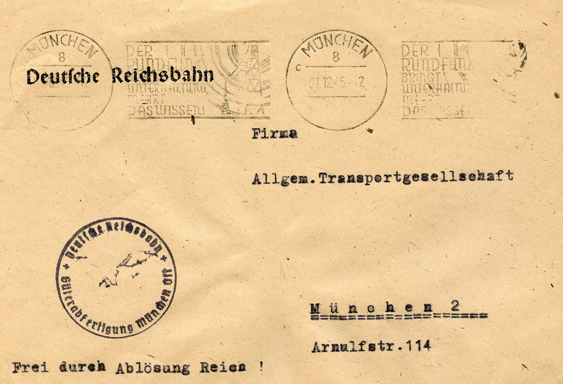 [Below: This one was sent by the German Reichsbahn (railroad) and uses a modified ink handstamp. This was postmarked on December 1, 1945.]