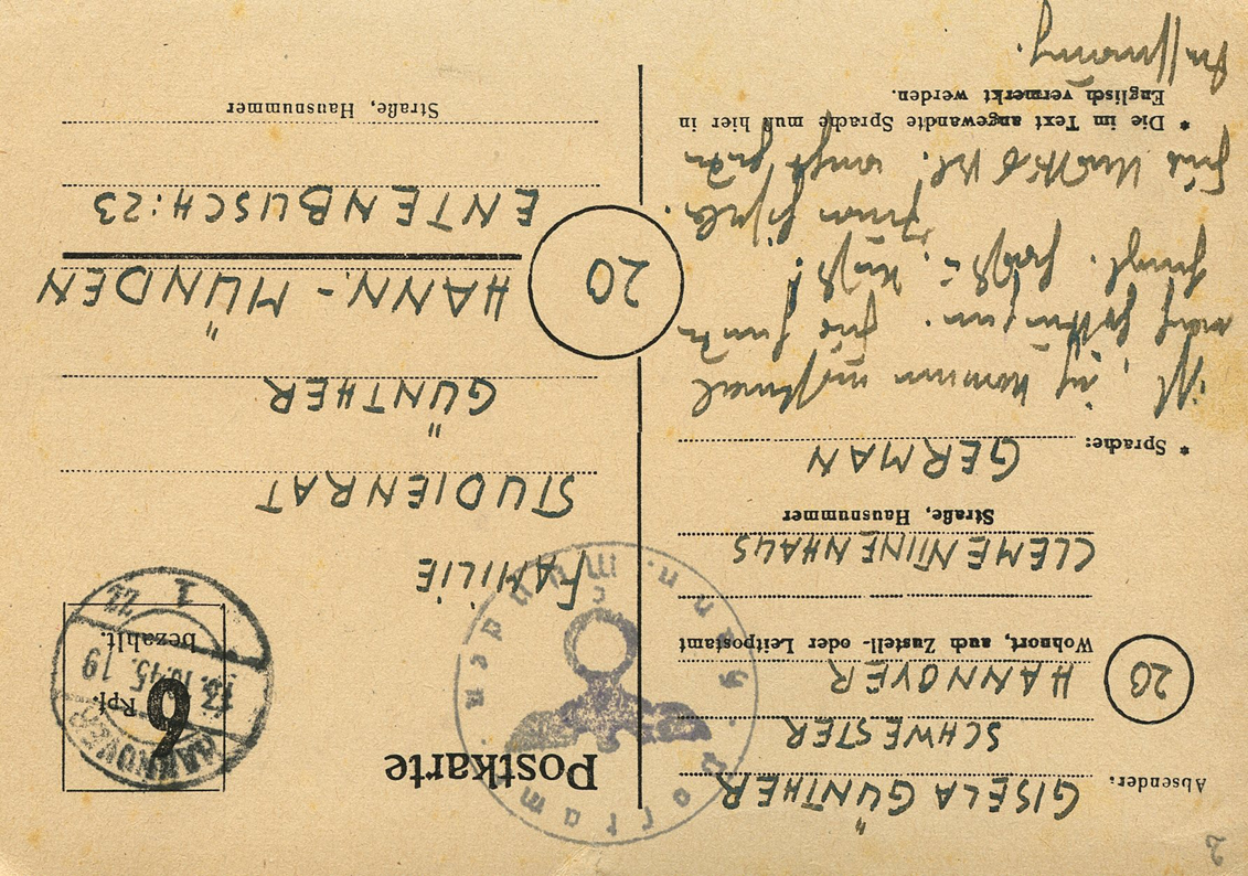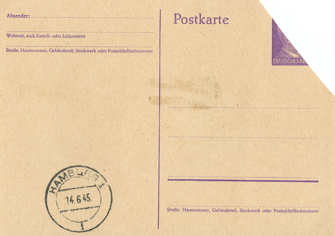 [Below: On this pre-paid postcard they've shaved off the entire eagle and swastika. Postmarked on September 11, 1945.]
