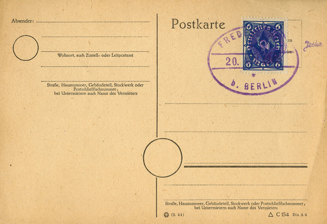 [Below: This is an interesting postcard with an equally interesting story. There were massive shortages after WWII in Europe, especially in Germany. Apparently a post office in Fredersdorf didn't have any postage stamps so a customer, a stamp collector, brought in old Imperial German stamp sheets from the 1920s. These were overprinted with a round blue circle with the initials 'FM' in the middle (which stood for the postmaster's name). These were then canceled with an oval postmark. There are fakes of this stamp, but this particular postcard is expertized (see the 'Jeske' stamp on the left of the postage stamp). This was postmarked on October 1, 1945.]