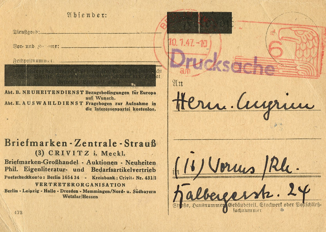 [Below: This uses a professionally blacked-out Feldpost postcard (top middle black boxes) and a 'de-Nazified' meter cancel (the swastika was in front of the eagle). This was postmarked on January 10, 1947.]