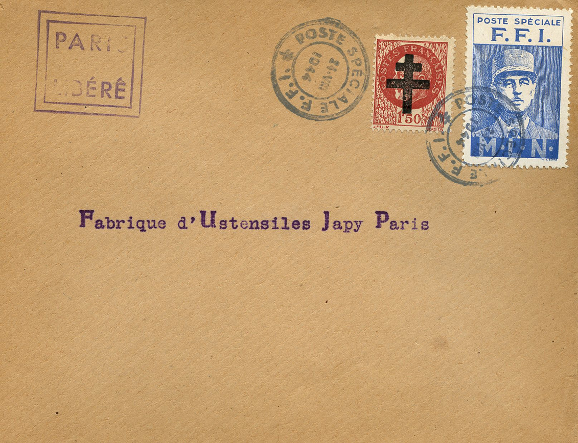 [Below: France's little puppet, Charles de Gaulle, who rode on America's tail into France, received by a country that did not want him or his semitic-style 'justice'. He personally ordered the murder of one of France's greatest writers Robert Brasillach, who was executed for hurting his enemies' feelings. Note the reddish brown postage stamp with the black Cross of Lorraine is an overprinted stamp of one of France's greatest war heroes Philippe Pétain, who was thrown in a dungeon for the rest of his life and denied burial on France. This was postmarked on August 24, 1944.]
